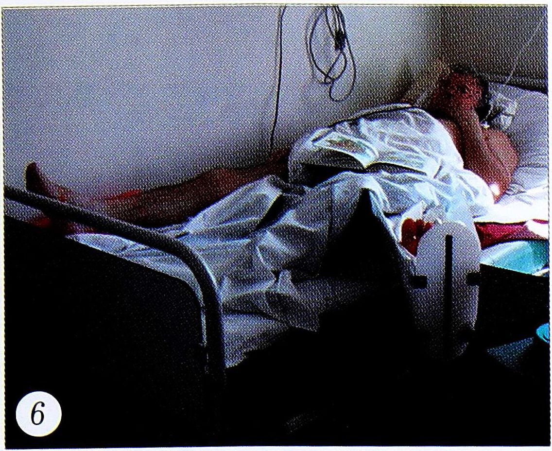 Рис. 6. Положение больного в постели с отведением оперированной конечности под углом 45° и фиксацией ее деротационной шиной в функционально нейтральной позиции.