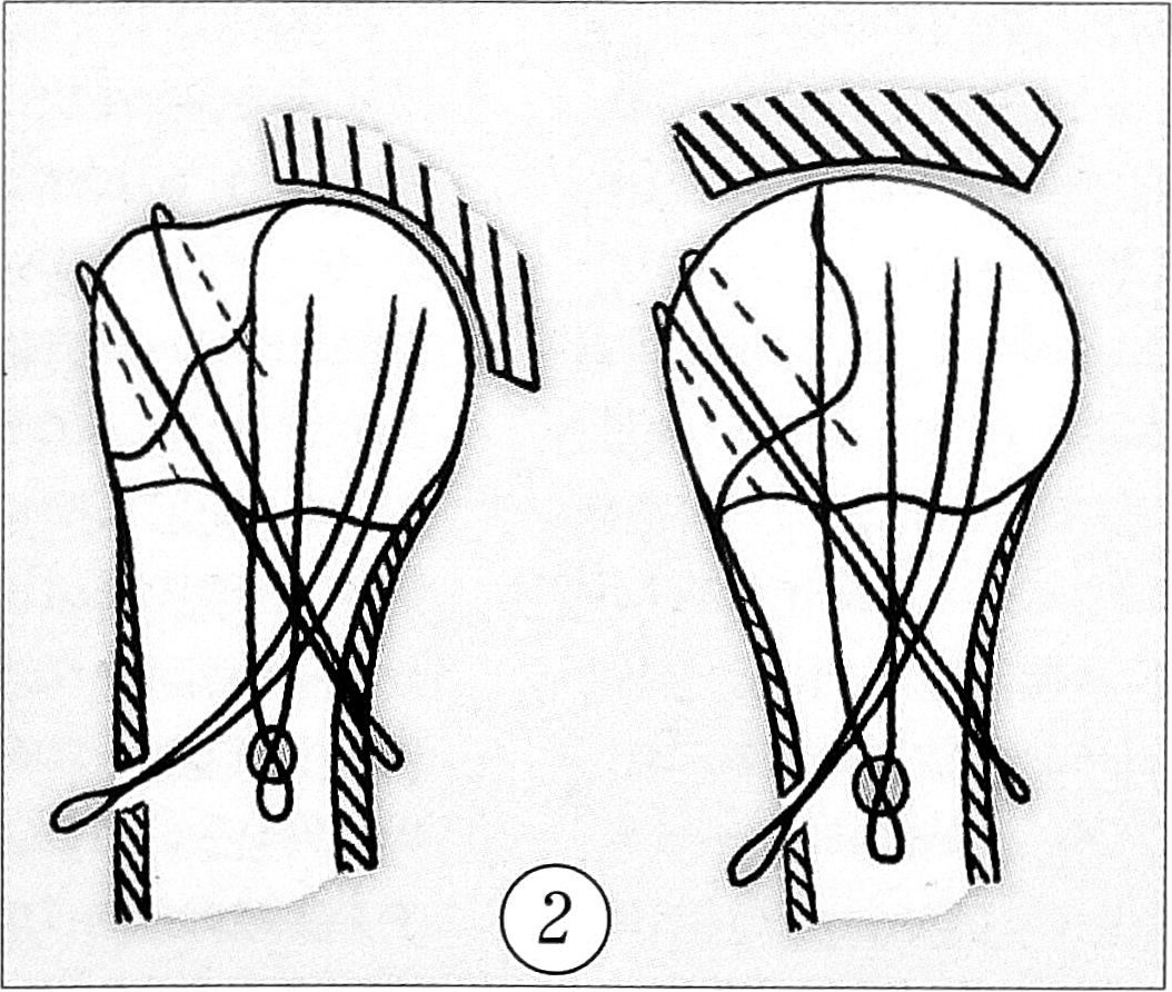 При двухфрагментарных переломах после репозиции отломков под контролем электронно-оптического преобразователя через разрез кожи до 1 см перфорировали кортикальный слой в области наружной поверхности верхней трети плеча сверлом диаметром 6 мм. Через перфорационное отверстие проводили направительную спицу до субхондрального слоя головки плечевой кости. По направительной спице измеряли необходимую длину напряженной спицы. Спицу диаметром 1,8 мм изгибали до приобретения ею Y-образной формы. Основание спицы выполнялось в виде полуокружности, при этом способ фиксации, образно говоря, походил на крепление елочной игрушки (рис. 1).