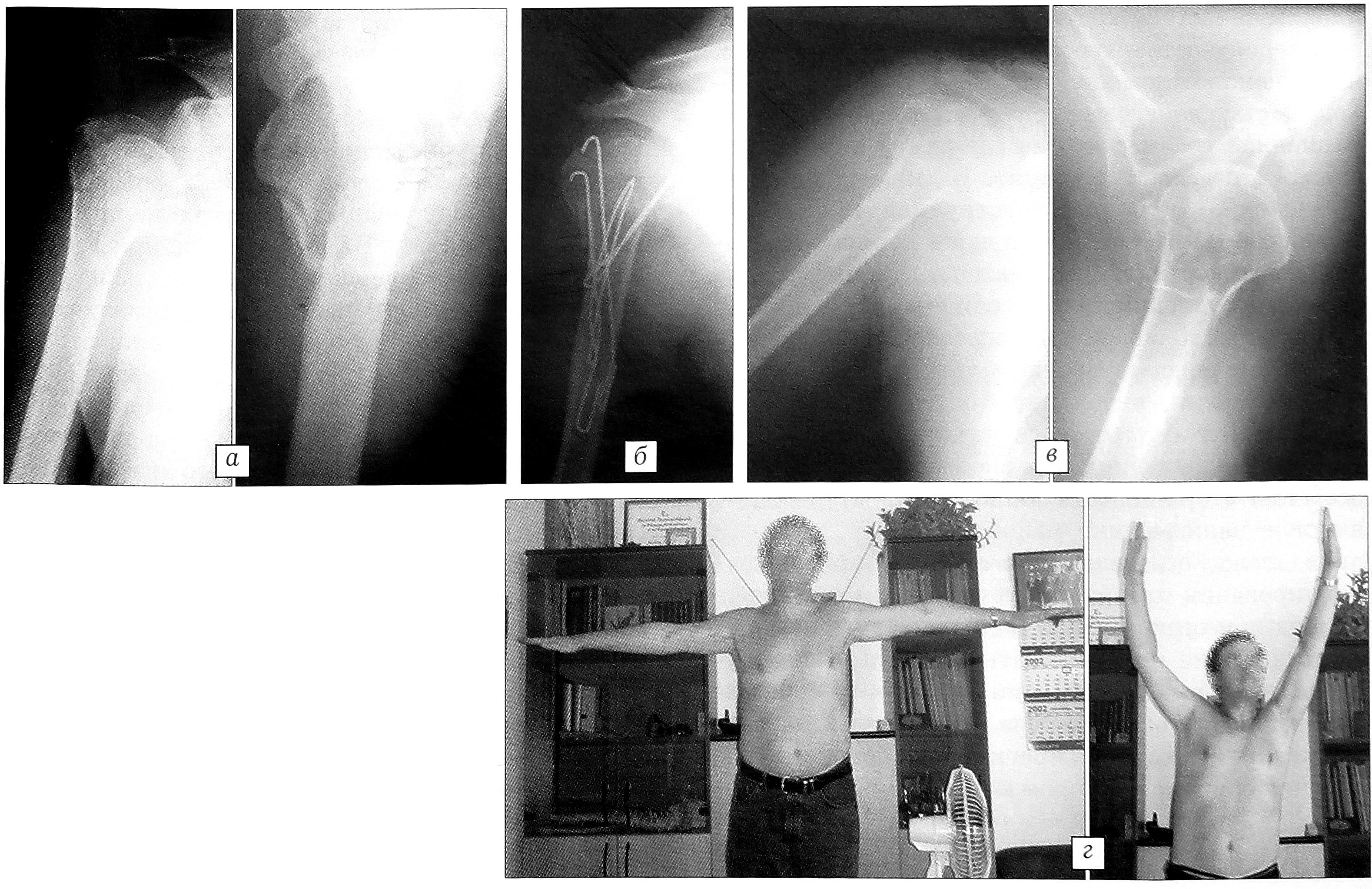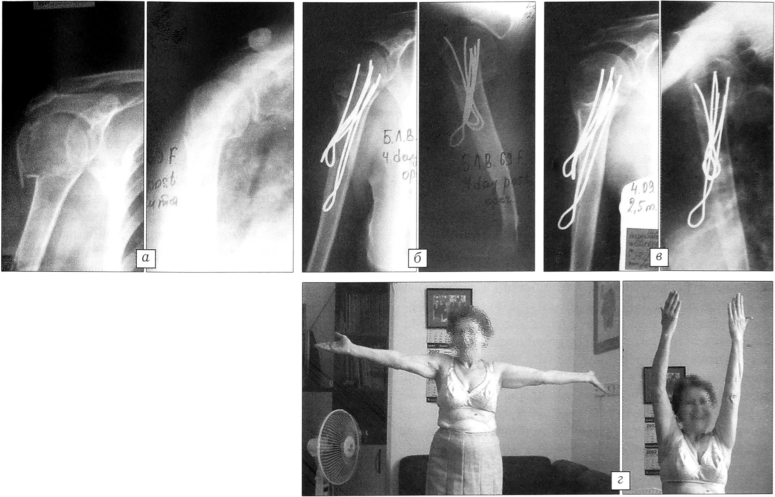 Рис. 4. Больной Г. 56 лет. Трехфрагментарный перелом хирургической шейки правой плечевой кости. а — рентгенограммы до операции; б — рентгенограмма после остеосинтеза Y-образными спицами с дополнительной якорной фиксацией большого бугорка; в — рентгенограммы, г — функция плечевого сустава через 3 мес после операции: металлофиксаторы удалены, перелом сросся, функция сустава восстановлена.