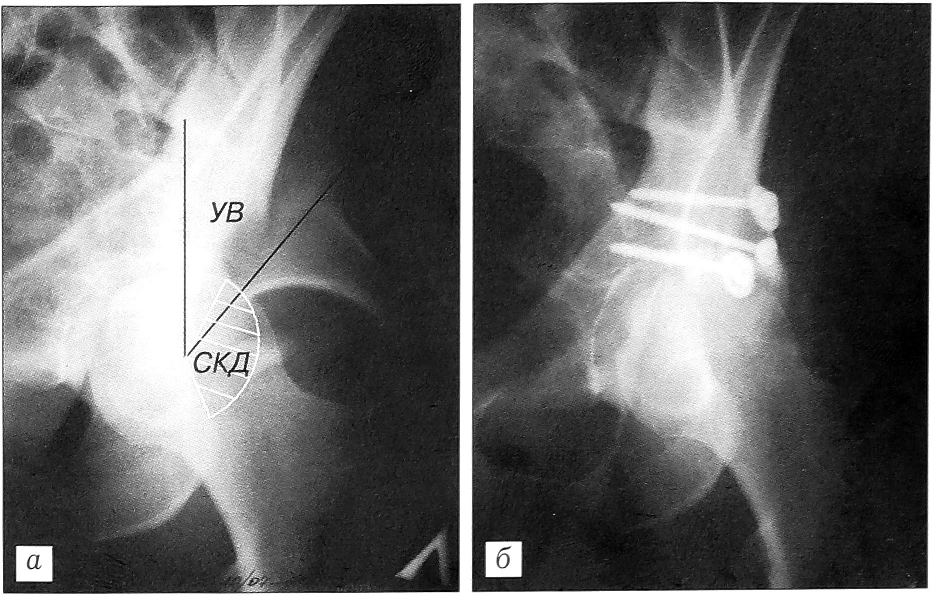 Рентгенограммы тазобедренного сустава (наружная косая проекция с ротацией таза 30°) больного с краевым переломом вертлужной впадины (УВ — угол Виберга, СКД — сектор краевого дефекта). а — при поступлении; б — после операции.