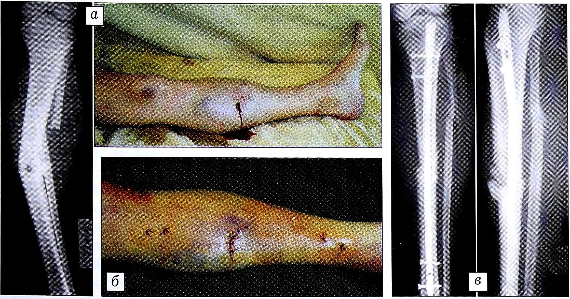 Рис. 2. Больной Б. 22 лет. Сочетанная травма. Открытый перелом голени типа IIIА по классификации Gustillo. а — вид конечности и рентгенограмма при поступлении; б — вид конечности после первичной хирургической обработки и остеосинтеза стержневым аппаратом; в — вид конечности и рентгенограммы после кожной пластики местными тканями и остеосинтеза стержнем UTN.