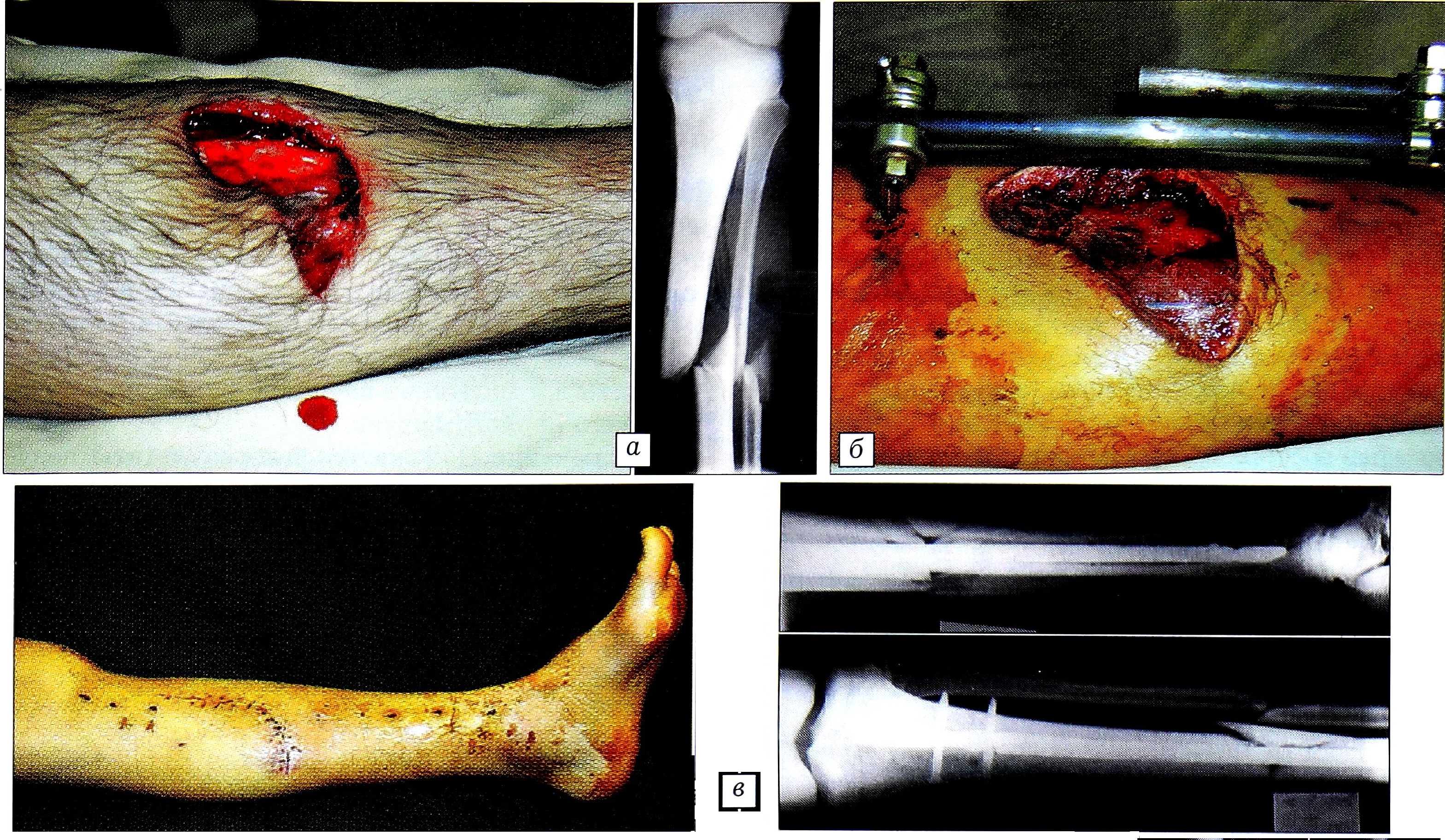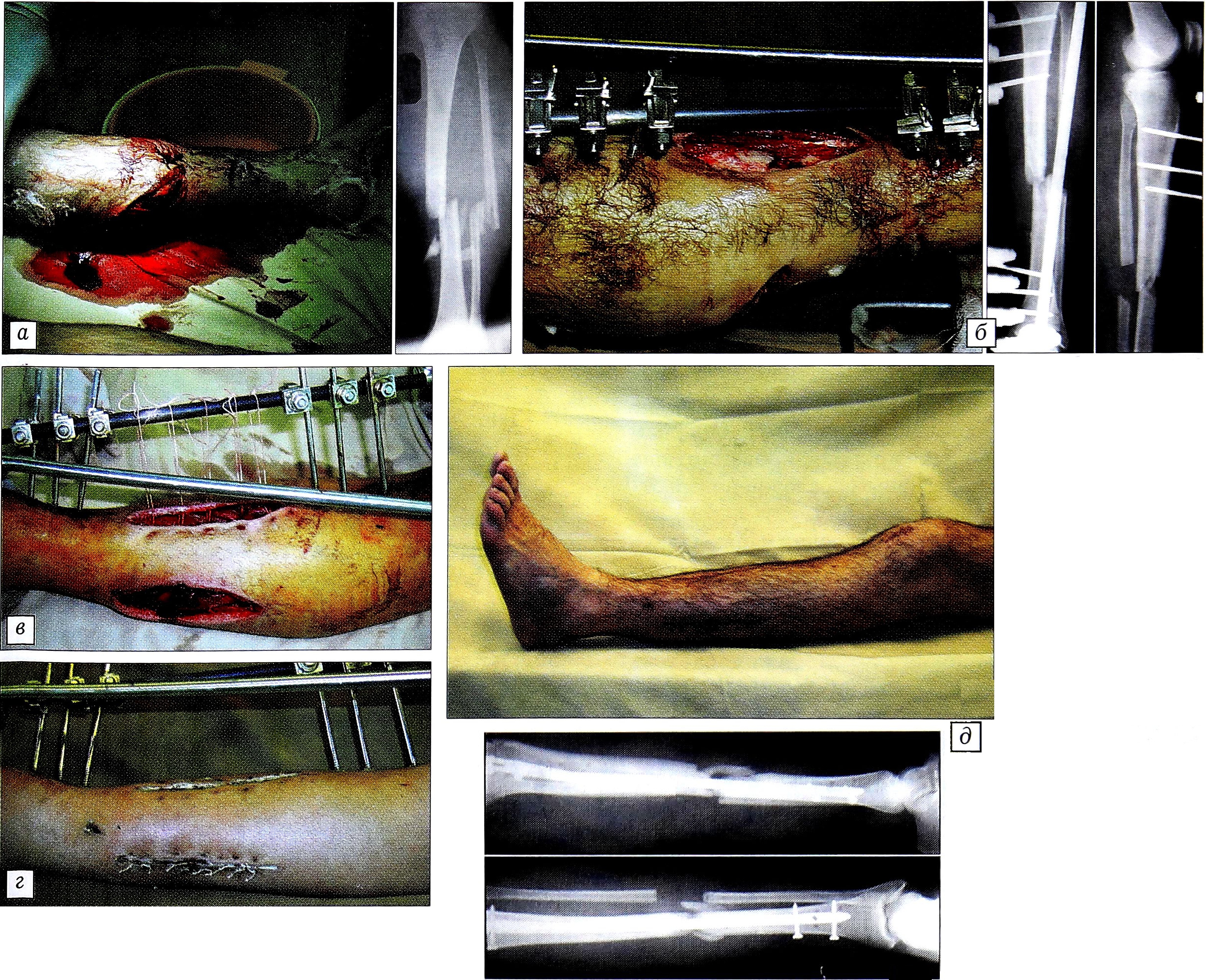 Рис. 3. Больной В. 28 лет. Открытый перелом голени типа IIIВ по классификации Gustillo. а — вид конечности и рентгенограмма при поступлении; б — после первичной хирургической обработки и остеосинтеза стрежневым аппаратом; в — после этапной хирургической обработки; г — после кожной пластики местными тканями; д — после замены аппарата стрежнем UTN.