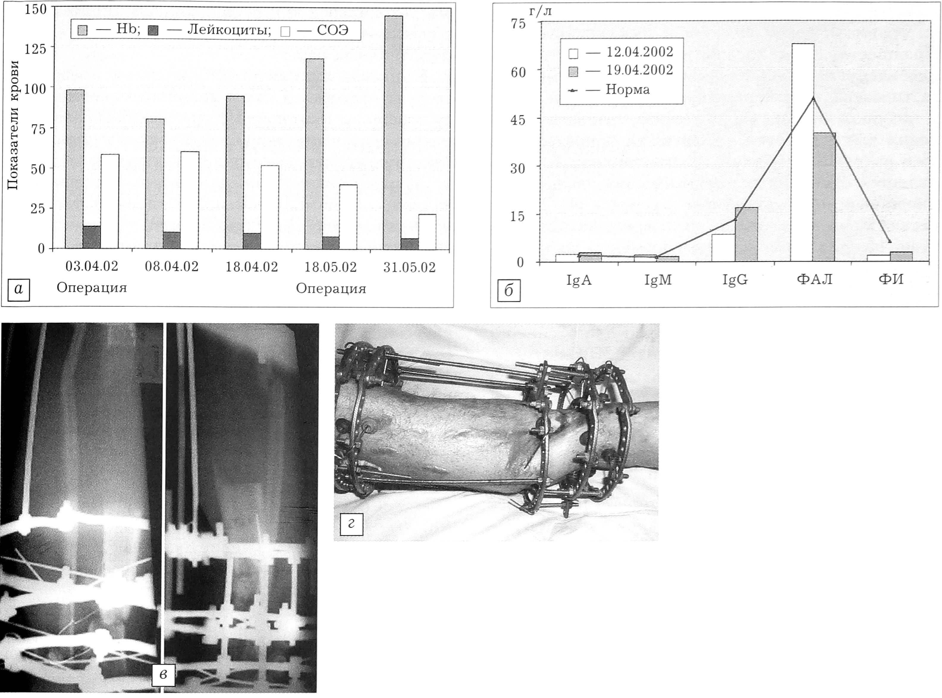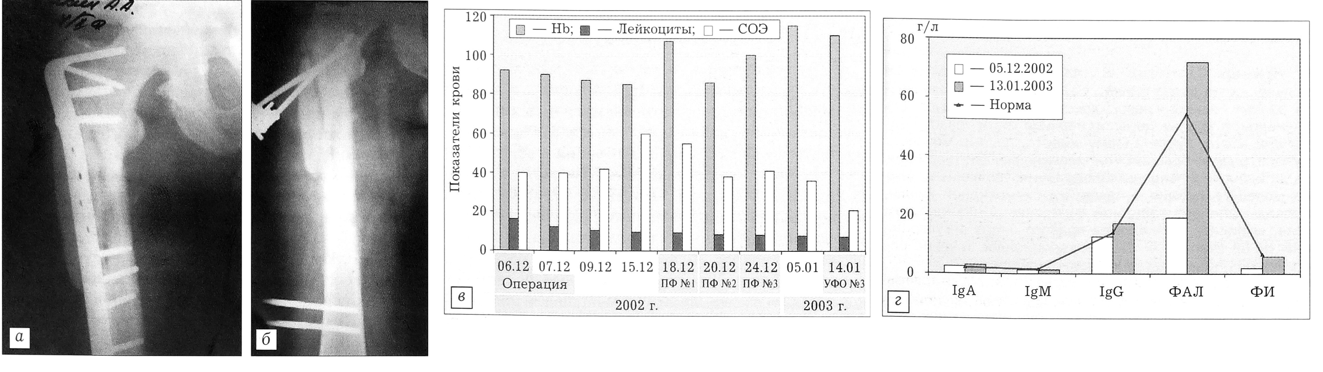 При повторном обращении через 6 мес после травмы (06.12.02) произведены удаление пластины, дренирование раны бедра активной аспирационно-промывной системой, фиксация отломков стержневым АНФ (рис. 1, б). После ликвидации интоксикации, нормализации температуры, показателей крови и иммунограммы (рис. 1, в, г), заживления раны АНФ снят и конечность фиксирована тазобедренным ортезом. В связи с интоксикацией больному проводился плазмаферез (5 сеансов). При первом сеансе плазма имела зеленый цвет. Микрофлора из свищей была представлена Citrobacter, Enterococcus, Е. coli. Антибактериальная терапия включала: ципрофлоксацин по 1 г в сутки, линкомицин 600 мг дважды в сутки в течение 7 дней с последующей заменой на медоцеф в дозе 4 г в сутки в течение 5 дней. Иммунологическое исследование в динамике показало возрастание фагоцитарного индекса и фагоцитарной активности лейкоцитов. Рана зажила первичным натяжением. 16.01.03 больной выписан на амбулаторное лечение.