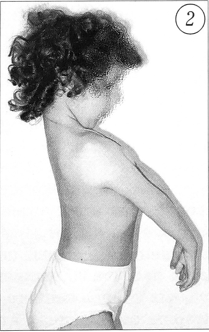 На передней поверхности грудной клетки часто имеется кожная складка в месте перехода на плечо, при пассивном отведении плеча выявляется резкое напряжение ее [5]. Отведение и сгибание в плечевых суставах обычно сочетаются, их объем зависит от степени развития дельтовидной мышцы. При отведении плеча больные отклоняют торс кзади, приподнимают надплечья и грудную клетку, при этом возможны движения в пределах 10-20° (рис. 2). Очень характерен внешний вид кисти. У одних больных кисть имеет форму «когтистой лапы»: пальцы разогнуты в пястно-фаланговых суставах и согнуты в межфаланговых. У других пациентов кисти фиксированы в положении тыльного сгибания, пальцы находятся в положении сгибательной контрактуры, а I палец приведен. При попытке вывести пальцы в правильное положение отмечается резкое натяжение сухожилий и кожи. У некоторых больных сгибательные движения пальцев сохранены, что значительно повышает способность к захвату предметов и расширяет возможности самообслуживания при наличии сгибательных контрактур в кистевых суставах.