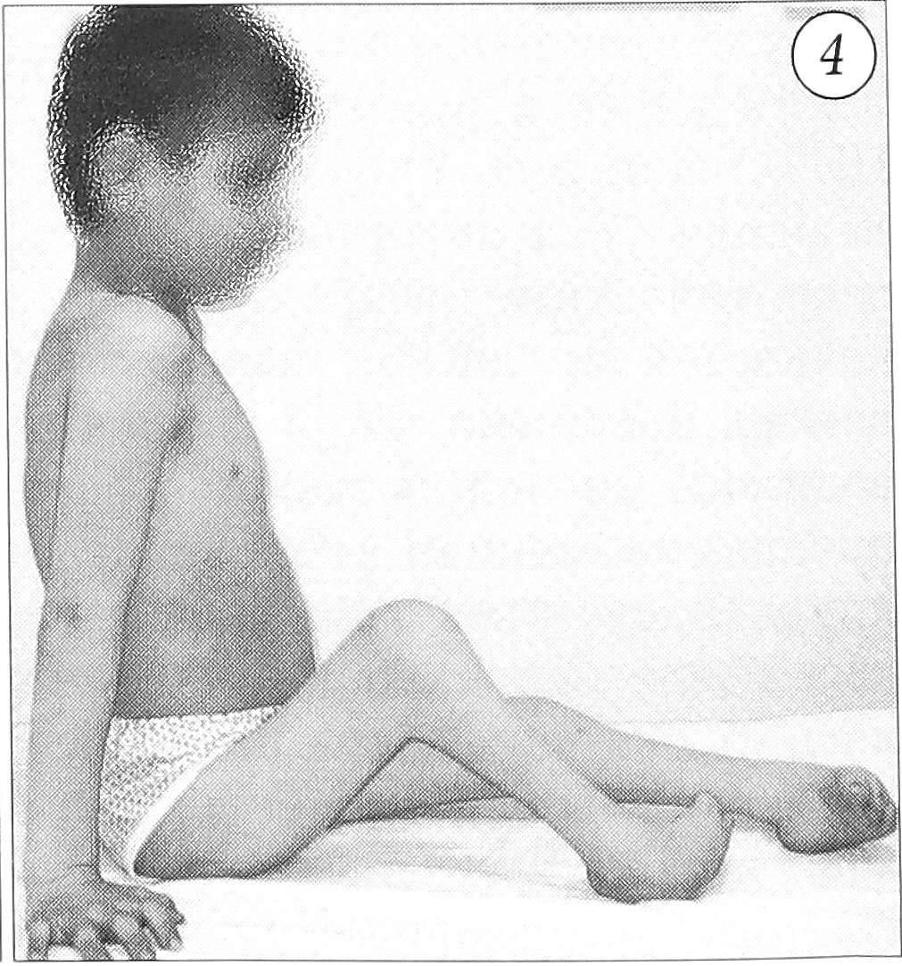 При поражении нижних конечностей клиническая картина также достаточно типична. У больных с поражением тазобедренных суставов чаще всего наблюдаются сгибательно-отводяще-наружно-ротационные контрактуры. При этом имеются ярко выраженный гиперлордоз, сгибательные контрактуры коленных суставов и поражение стоп (рис. 3), так как чаще всего страдают мышцы, разгибающие бедро, голень и стопу. Однако у некоторых больных отмечаются активные сгибательные движения в тазобедренных суставах. Сгибание в коленных суставах варьирует от 80 до 170° и может сопровождаться подвывихом костей голени. Контрактуры суставов нижних конечностей могут быть как симметричными, так и асимметричными (рис 4). В подколенной области имеется кожная складка. Стопы вовлекаются в патологический процесс при деформации суставов нижних конечностей практически всегда. В большинстве случаев отмечается артрогрипотическая косолапость, являющаяся нетипичной формой косолапости. Реже наблюдаются пяточные или плосковальгусные стопы.