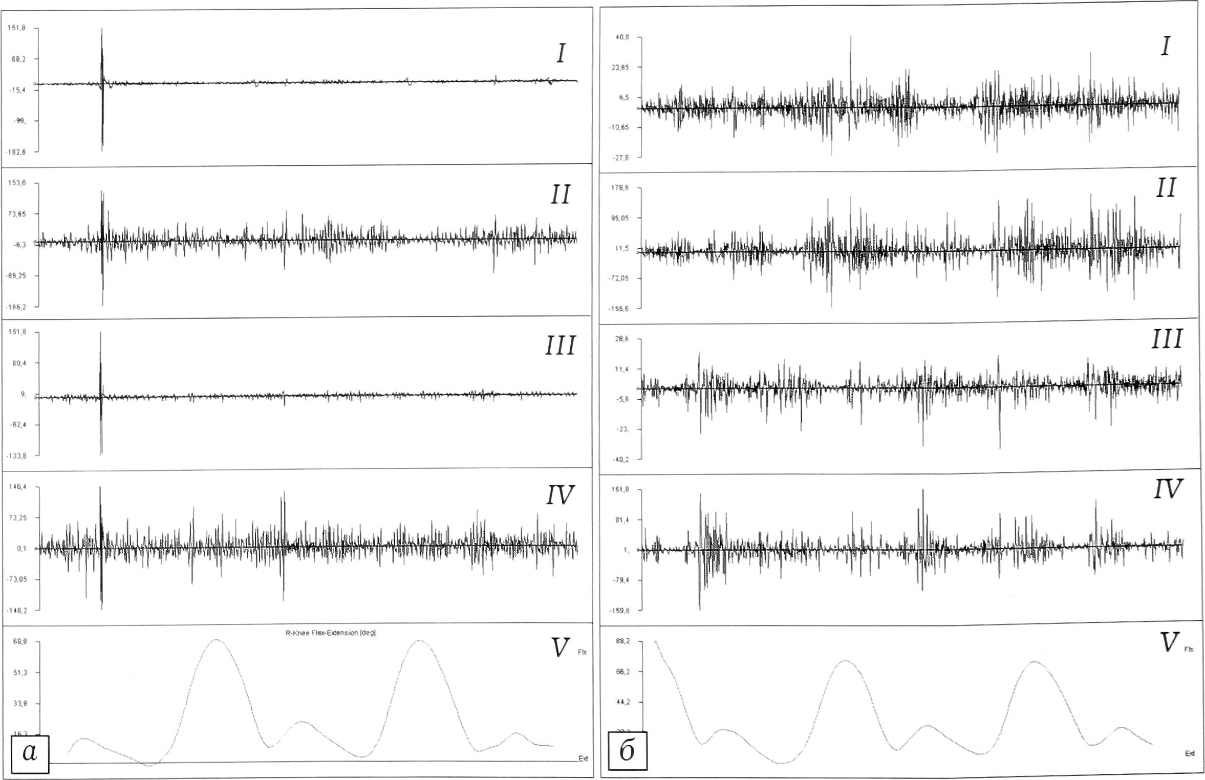 Рис. 5. Произвольная биоэлектрическая активность дельтовидных и трапециевидных мышц больного Л. при обычной ходьбе (а) и при имитации махов руками в такт ходьбе (б). I — левая дельтовидная, II — левая трапециевидная, III — правая дельтовидная, IV — правая трапециевидная мышцы, V — гониограмма правого коленного сустава.