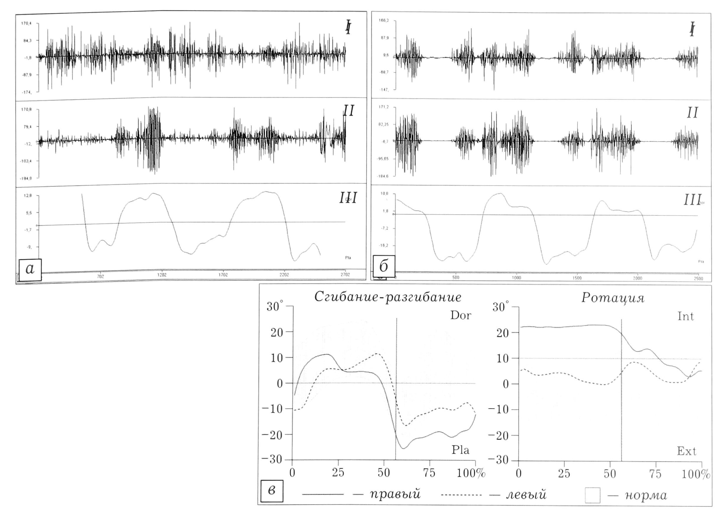 Рис. 6. Произвольная биоэлектрическая активность мышц-сгибателей (1) и разгибателей (II) стопы и гониограмма голеностопного сустава (III) больного Л. в ходьбе: а — левая, б — правая нога: в — гониограммы голеностопных суставав в цикле шага.