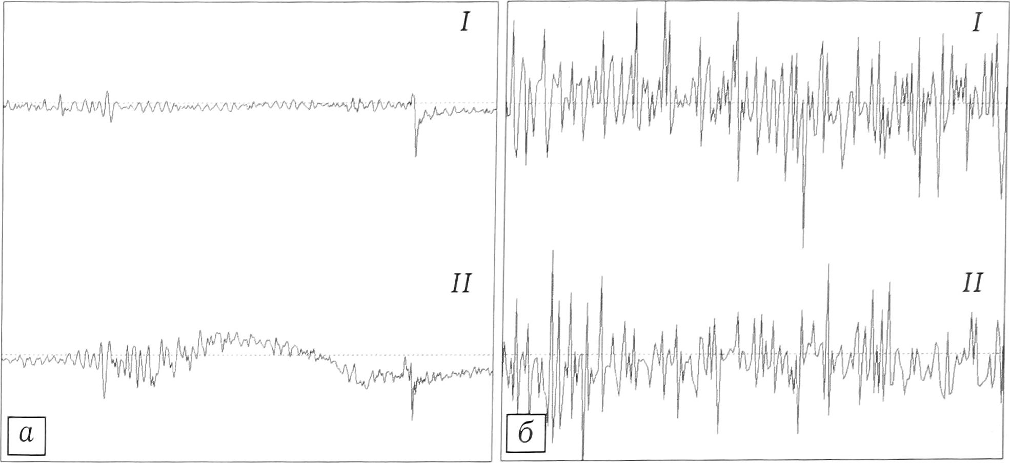 Рис. 8. Произвольная биоэлектрическая активность дельтовидной (I) и двуглавой (II) мышц правой руки больного О. до (а) и после (б) лечения методом функционального биоуправления.