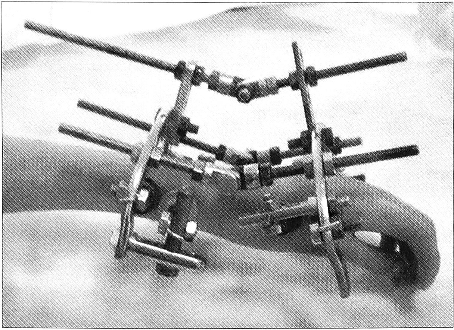 Чрезвычайно сложной задачей является лечение рецидивов косолапости на почве артрогрипоза. Особенно это относится к детям старшего возраста, у которых деформации стоп чаще всего бывают уже фиксированными, так как имеются и комплекс деформаций в костной системе стопы, и стойкие патологические изменения мягких тканей [1]. Необходимо отметить, что применяемые до сих пор некоторыми ортопедами оперативные вмешательства на костных структурах стоп (клиновидные и сегментарные резекции костей стопы, резекции и удаление таранной кости и т.д.) в случаях рецидивов деформации являются необоснованными и недопустимыми у больных детского возраста. Подобные вмешательства приводят к ухудшению не только анатомического, но и функционального состояния стопы. По нашему мнению, любые деформации можно исправить более щадящими, физиологичными методами, например, с помощью аппаратов чрескостной фиксации. Больше всего подходит для этой цели аппарат Илизарова: применение его удобно, малотравматично, позволяет осуществлять детальную коррекцию всех элементов деформации постепенно, учитывая механизмы ее формирования. Использование аппаратов внешней фиксации исключает такую проблему, как нехватка кожи, возникающую при ушивании раны в случаях одномоментной коррекции косолапости. Однако в литературе лечение артрогрипотической косолапости аппаратами практически не освещено, наиболее широко этот метод использовался в работе О.А Баталова. Следует отметить, что применяемые аппараты не всегда корректны: некоторые из них слишком громоздки, другие слишком примитивны и их компоновка не учитывает патомеханизмов деформации стопы.