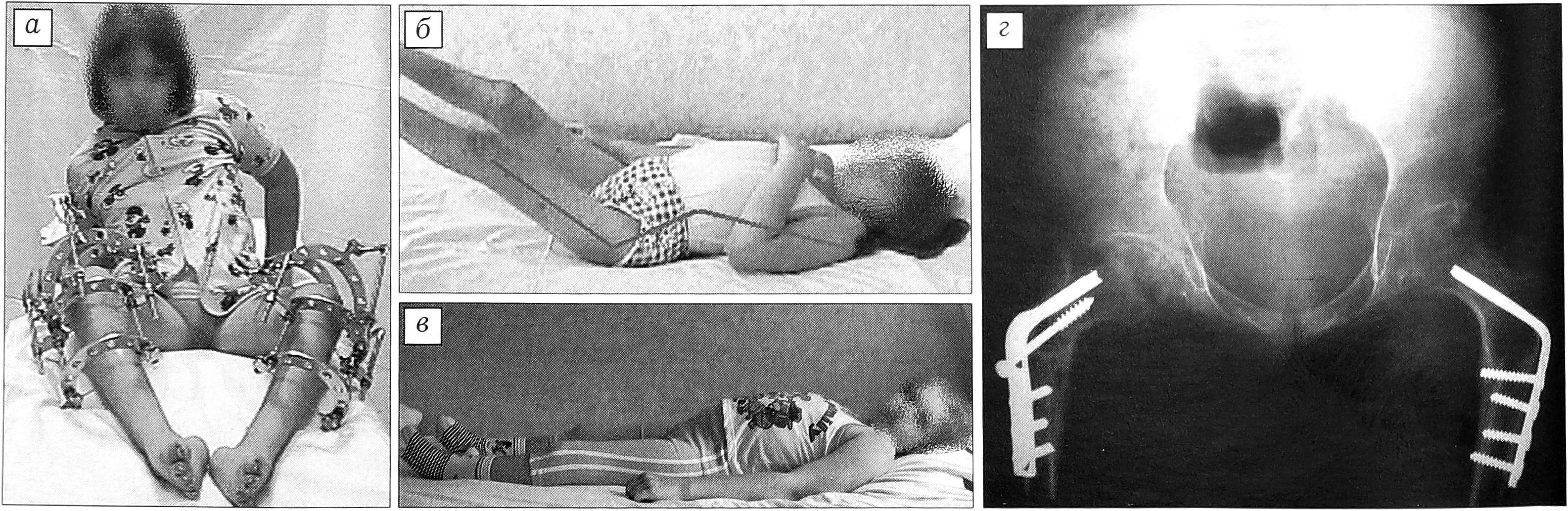 Рис. 11. Больная П. 9 лет. Диагноз: артрогрипоз, контрактуры суставов нижних конечностей. а — первый этап лечения — коррекция контрактур коленных суставов в аппаратах Волкова—Оганесяна; б — после первого этапа лечения: сгибательные контрактуры тазобедренных суставов; в — внешний вид, г — рентгенограмма после второго этапа лечения.