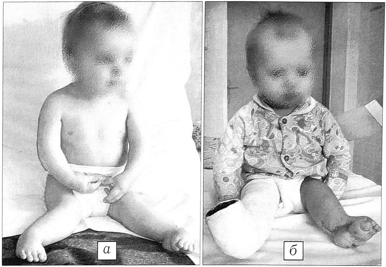 Рис. 12. Больной Б. Диагноз: артрогрипоз, двусторонняя деформация стоп. а — при поступлении; б — на этапе лечения.