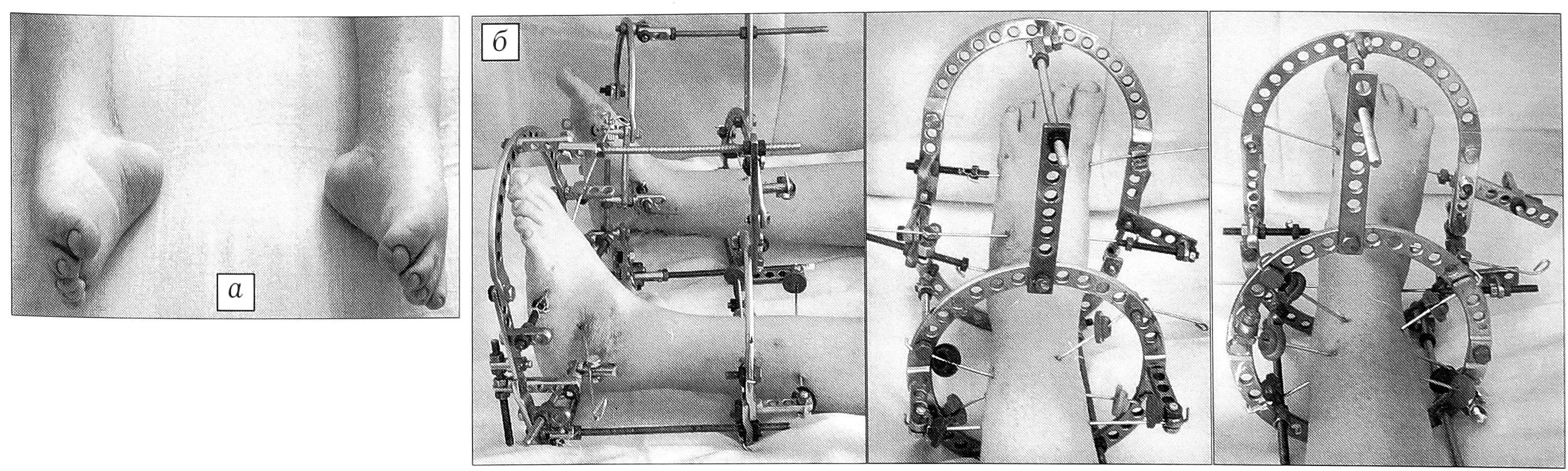Рис. 13. Лечение артрогрипотической косолапости с применением аппарата Илизарова: а — до лечения, б — в процессе лечения.