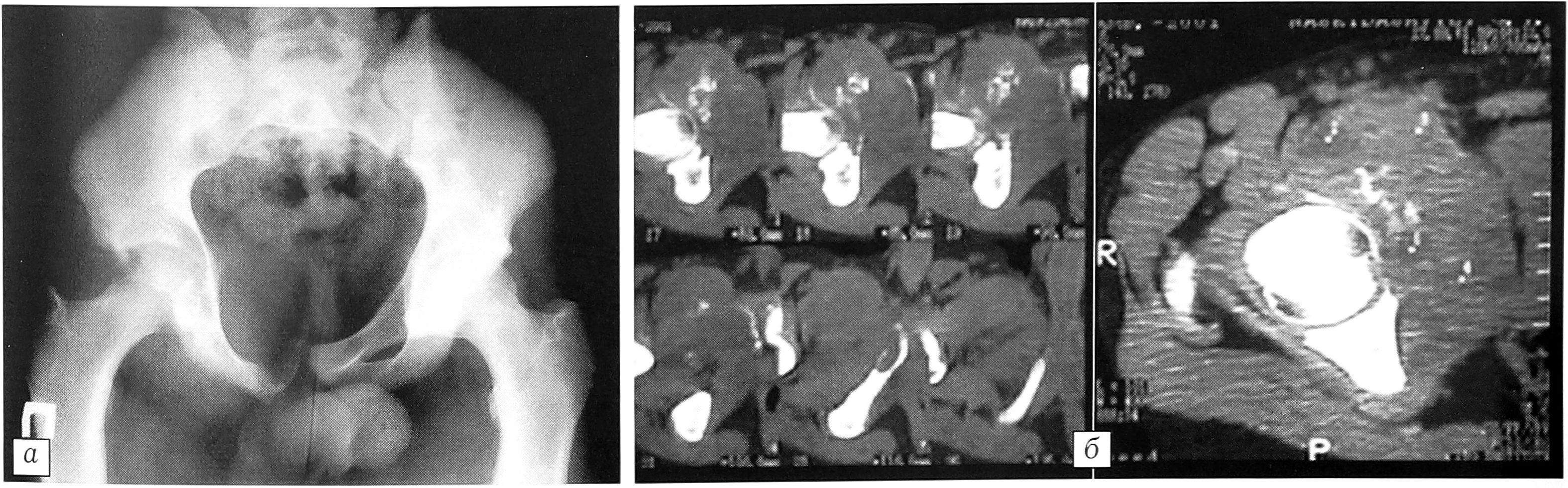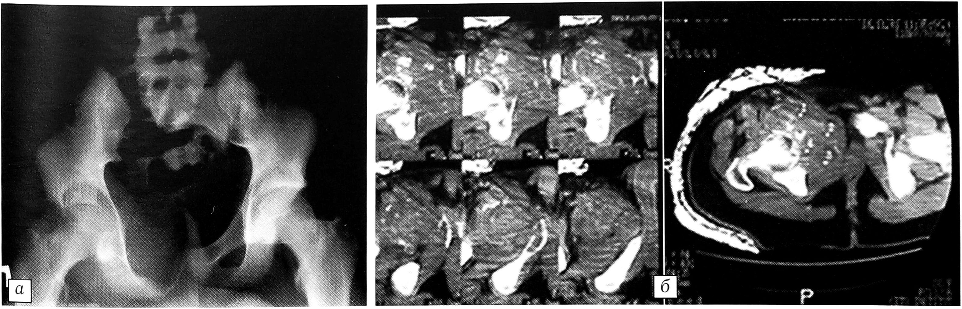Рис. 2. Рентгенограмма таза (а) и компьютерная томограмма (б) через 1 мес: отмечается прогрессирование патологического процесса.