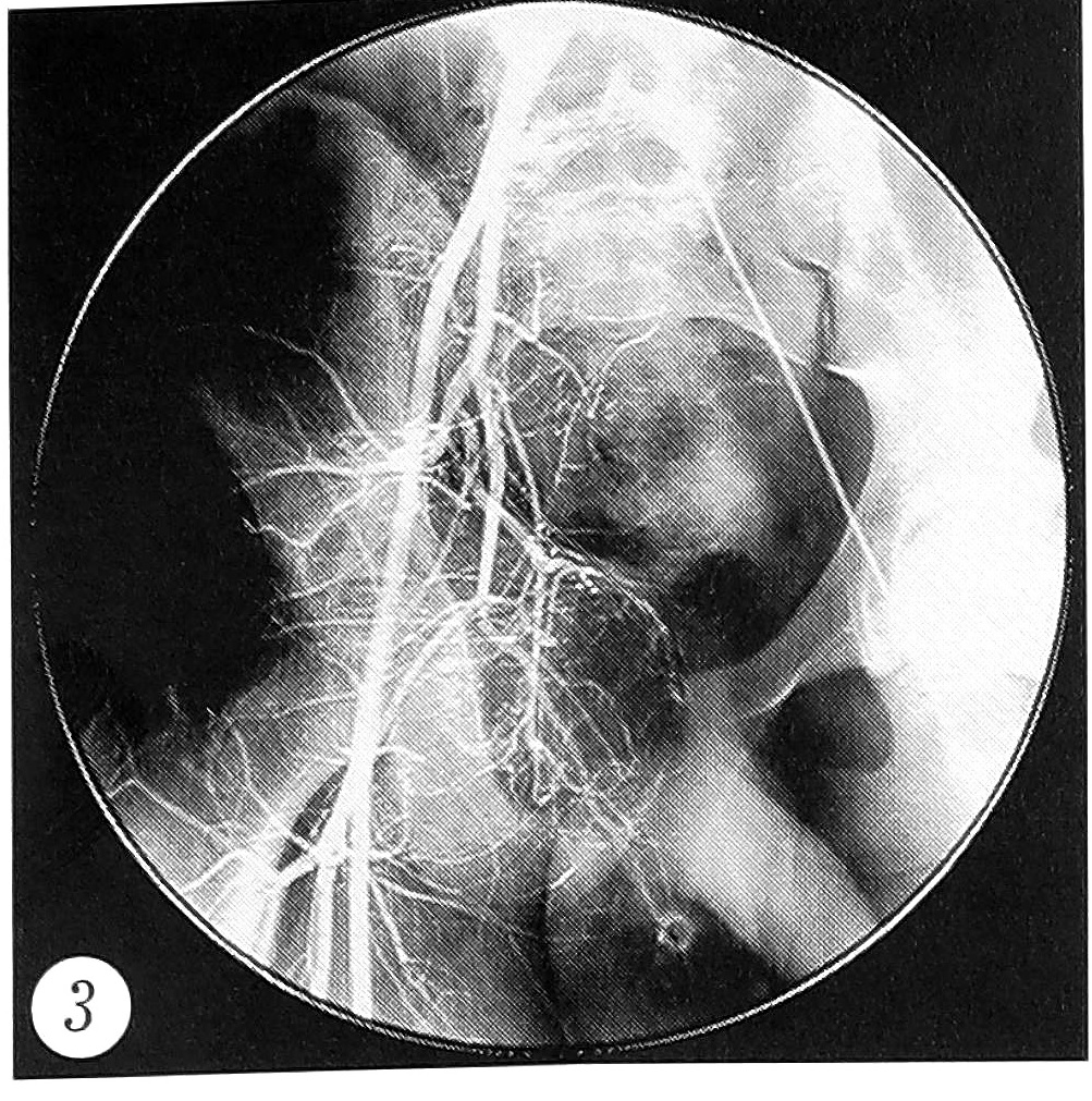 Принимая во внимание резкую отрицательную клинико-рентгенологическую динамику заболевания, а также его доброкачественную природу, было решено произвести хирургическое вмешательство. С учетом ожидаемой массивной кровопотери перед операцией выполнена ангиография для выявления питающего очаг сосуда и его последующей временной окклюзии с целью уменьшения кровотечения во время операции. Обнаружено, что питание очага осуществляется из бассейна внутренней подвздошной артерии, очаг состоит из четырех узлов, обильно кровоснабжаемых патологической сетью сосудов (рис. 3).