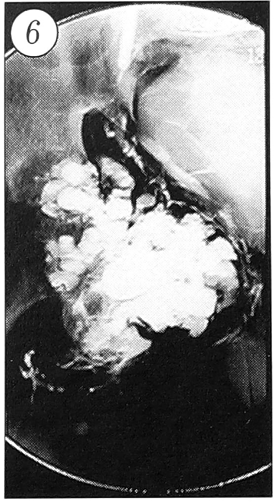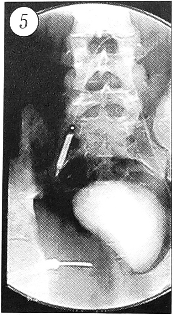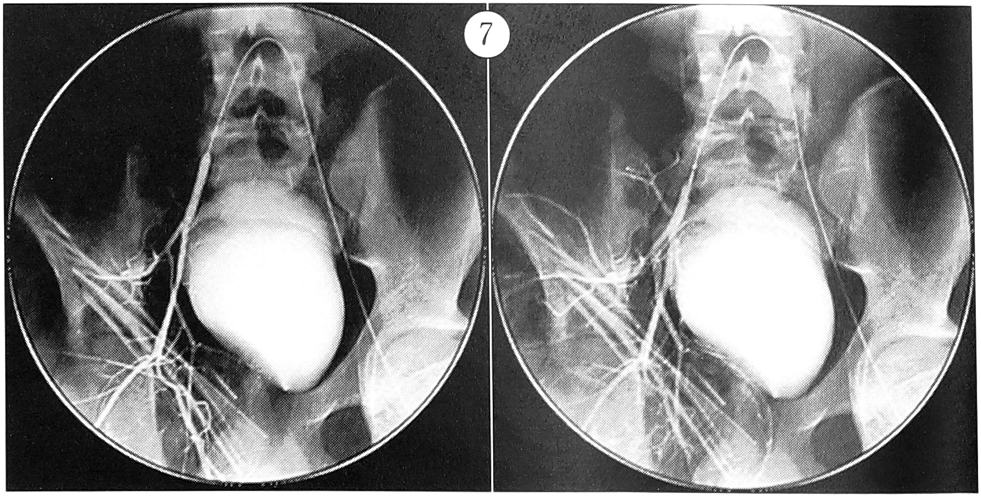 Произведена временная окклюзия внутренней подвздошной артерии баллонным катетером 6,0 × 30 мм (рис. 5). Повторно измерено внутрикистное давление — 500 мм вод. ст. (рис. 4, б). Для выявления возможного вовлечения в патологический процесс мочевого пузыря предпринято контрастирование очага омнипаком (20 мл): стенки пузыря оказались интактными (рис. 6).
