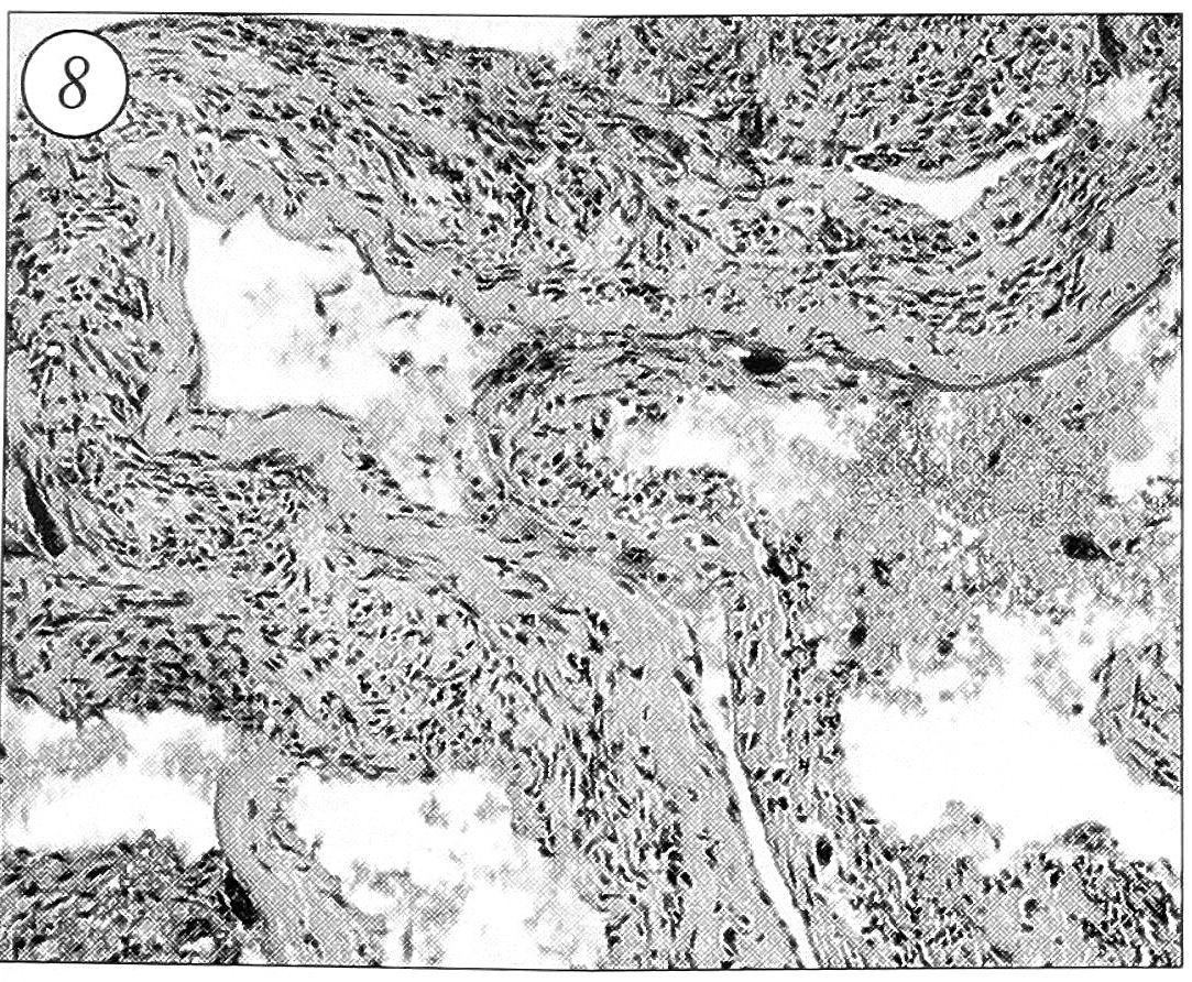 Рис. 8. Гистологическая картина: активно растущая аневризмальная киста кости. Полости с элементами крови, разграниченные соединительнотканными перегородками, в которых видны полиморфные фибробласты, гистиоциты, отдельные остеокластоподобные клетки, остеоидные трабекулы. Окраска гематоксилином и эозином, ув. 100.