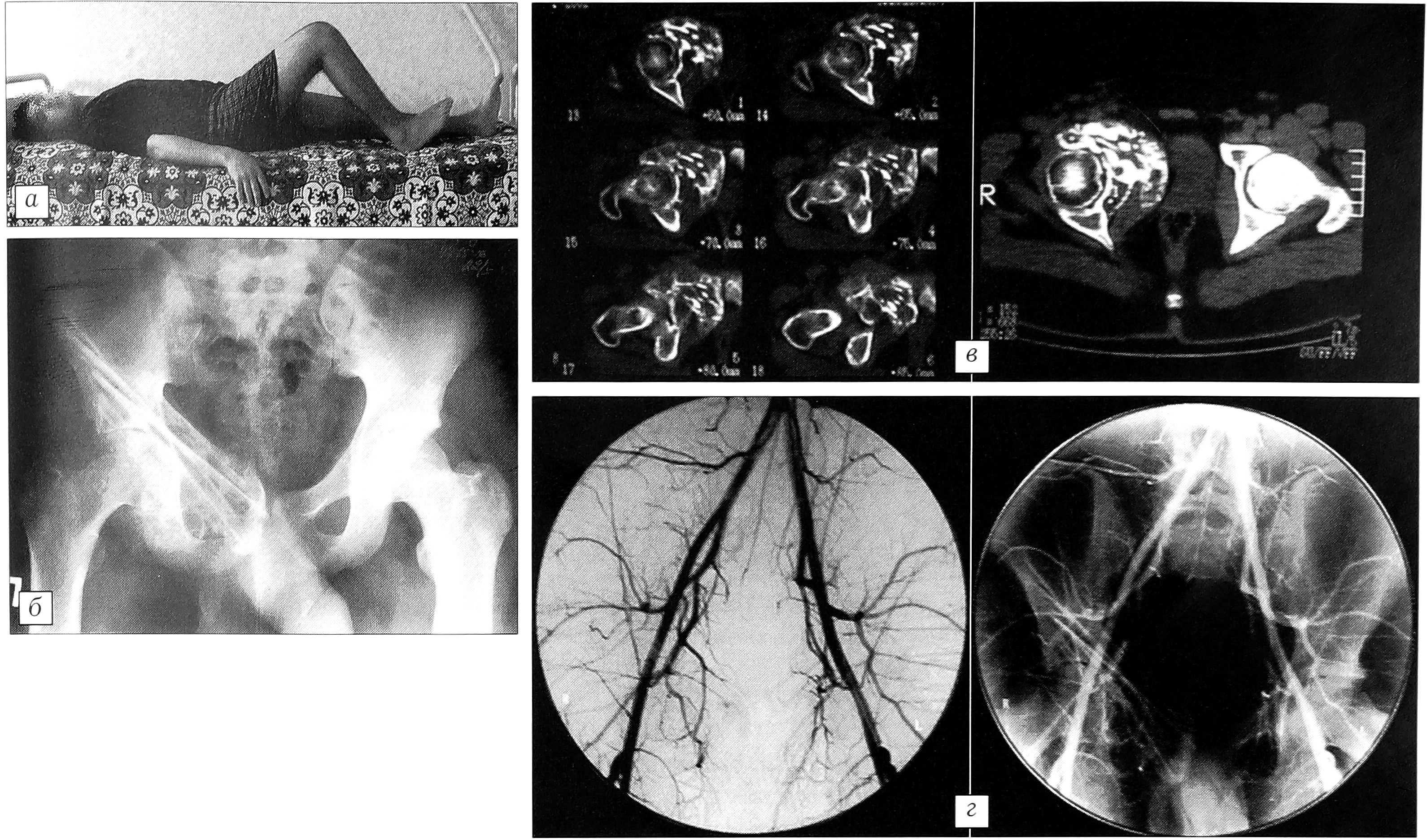 При контрольном обследовании через 6 мес после операции пациент жалоб не предъявляет, движения в правом тазобедренном суставе: разгибание 180°, сгибание 120°, отведение и приведение по 20° (рис 9, а). На рентгенограмме и компьютерной томограмме признаков рецидива нет, отмечается органотипическая перестройка трансплантатов (рис 9, б, в). При контрольной ангиографии патологической сосудистой сети в области операции не выявлено (рис. 9, г).