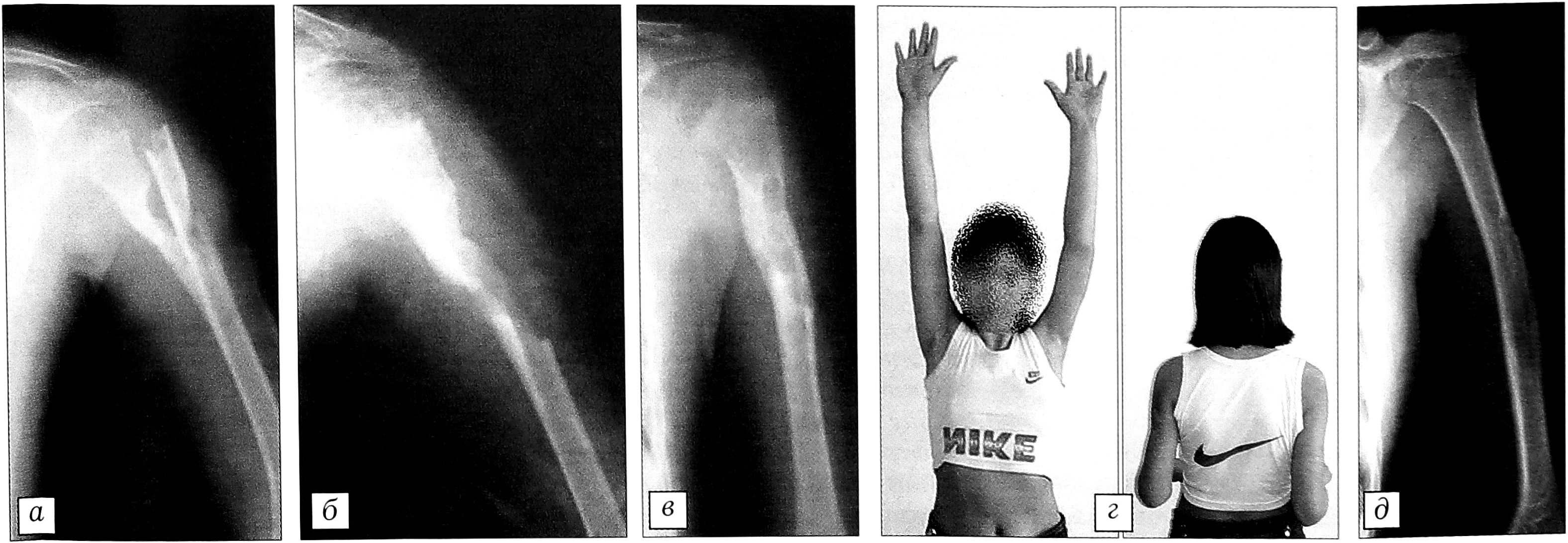 Через 6 нед снята гипсовая повязка. Общее состояние девочки удовлетворительное, анализы крови, мочи без патологии. На контрольной рентгенограмме хорошо выраженная пери- и эндостальная костная мозоль Начата дозированная лечебная гимнастика. Через 2 мес достигнуто полное восстановление функции конечности, хотя сохранялась умеренная гипотрофия мышц плеча. Через 1 год дефект полностью закрылся органотипическим регенератом (см. рисунок, в). Больная осмотрена через 7 лет после остеопластики. Клинически ось плеча правильная, объем движений в плечевом и локтевом суставах полный, абсолютное укорочение конечности за счет плеча 3 см (г). Рентгенологически костная структура в области бывшего дефекта не отличается от таковой в смежных отделах (д).