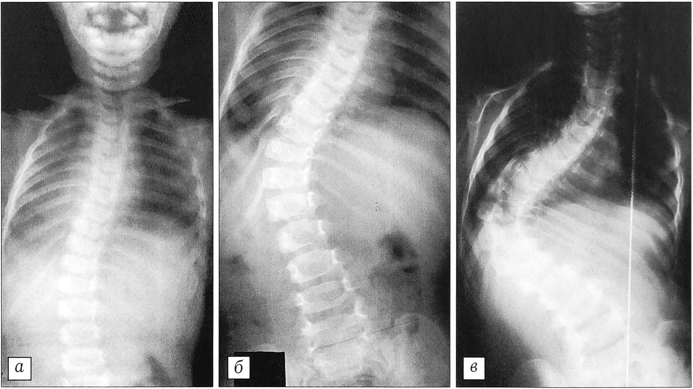 Рис. 1. Больная Г-ра. Злокачественное прогрессирование инфантильного сколиоза исключает возможность выжидательной тактики: в возрасте 1 года деформация 23° (а), в 2 года — 48° (б), в 4 года — 110° (в).