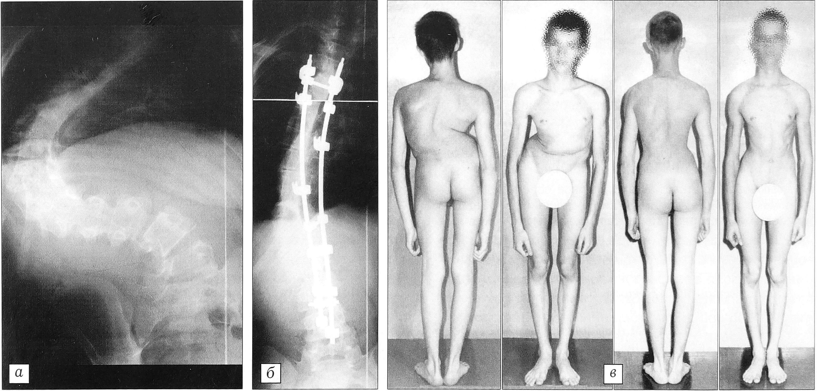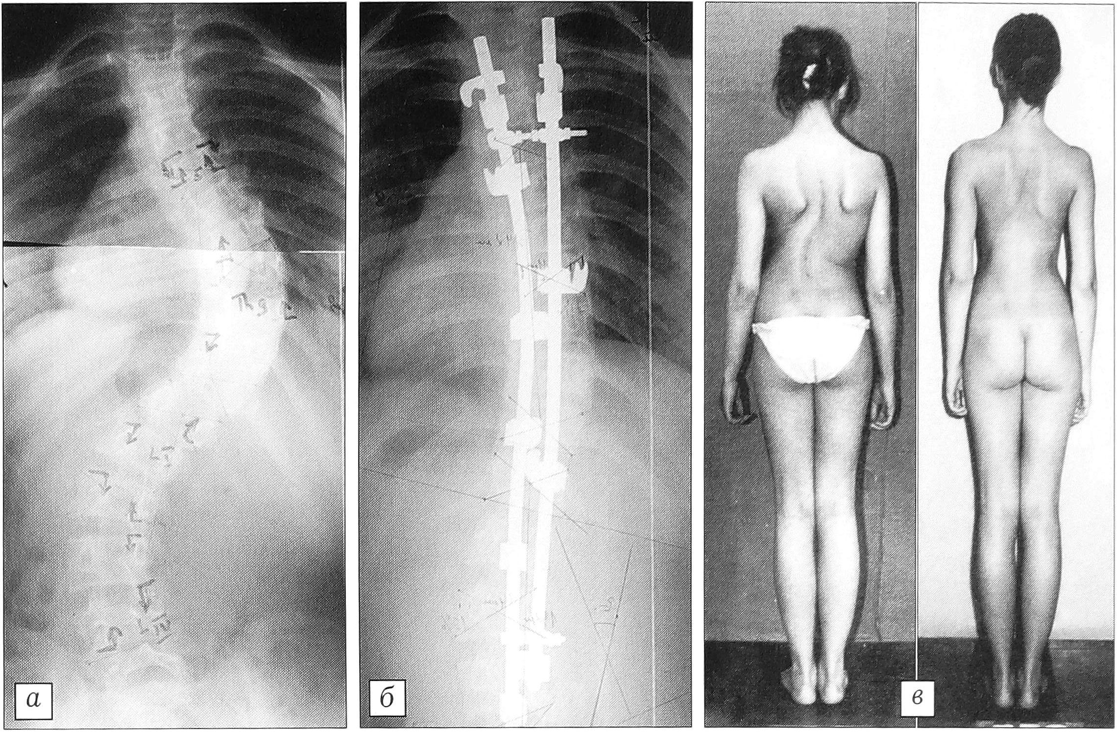 Рис. 6. Больной С-ов 16 лет (запущенная деформация). Коррекция грудопоясничной дуги в результате двухэтапного вмешательства со 128° (а) до 36° (б). Срок наблюдения 3 года (в), потери коррекции не отмечено.