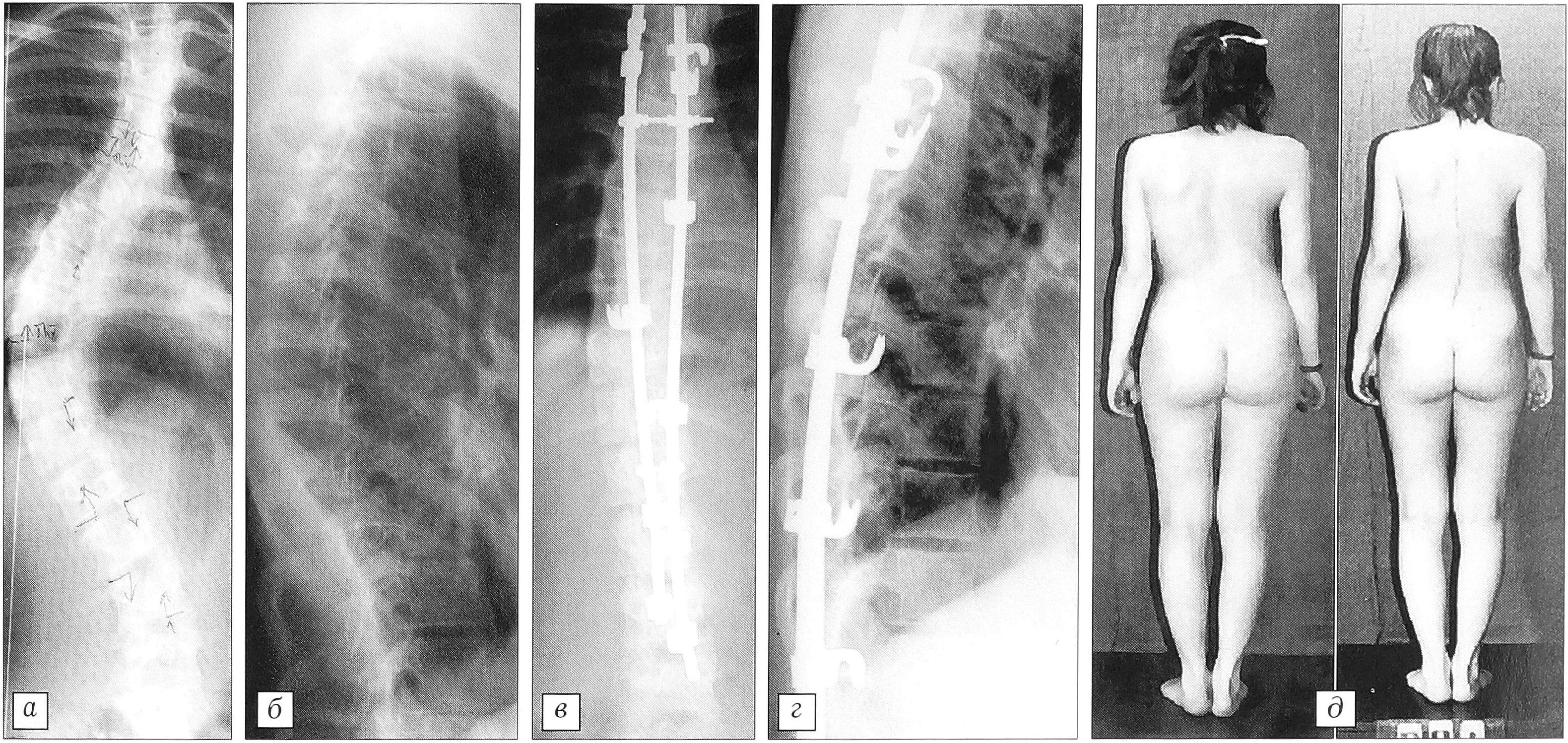 Рис. 4. Больная Х-ва 15 лет (подростковый сколиоз). Коррекция первичной дуги в результате одноэтапного вмешательства с 64° (а) до 23° (б). Грудной кифоз с помощью «деротирующего маневра» увеличен с 6° (в) до 27° (г). Срок наблюдения 5 лет (б), потеря коррекции 3°.