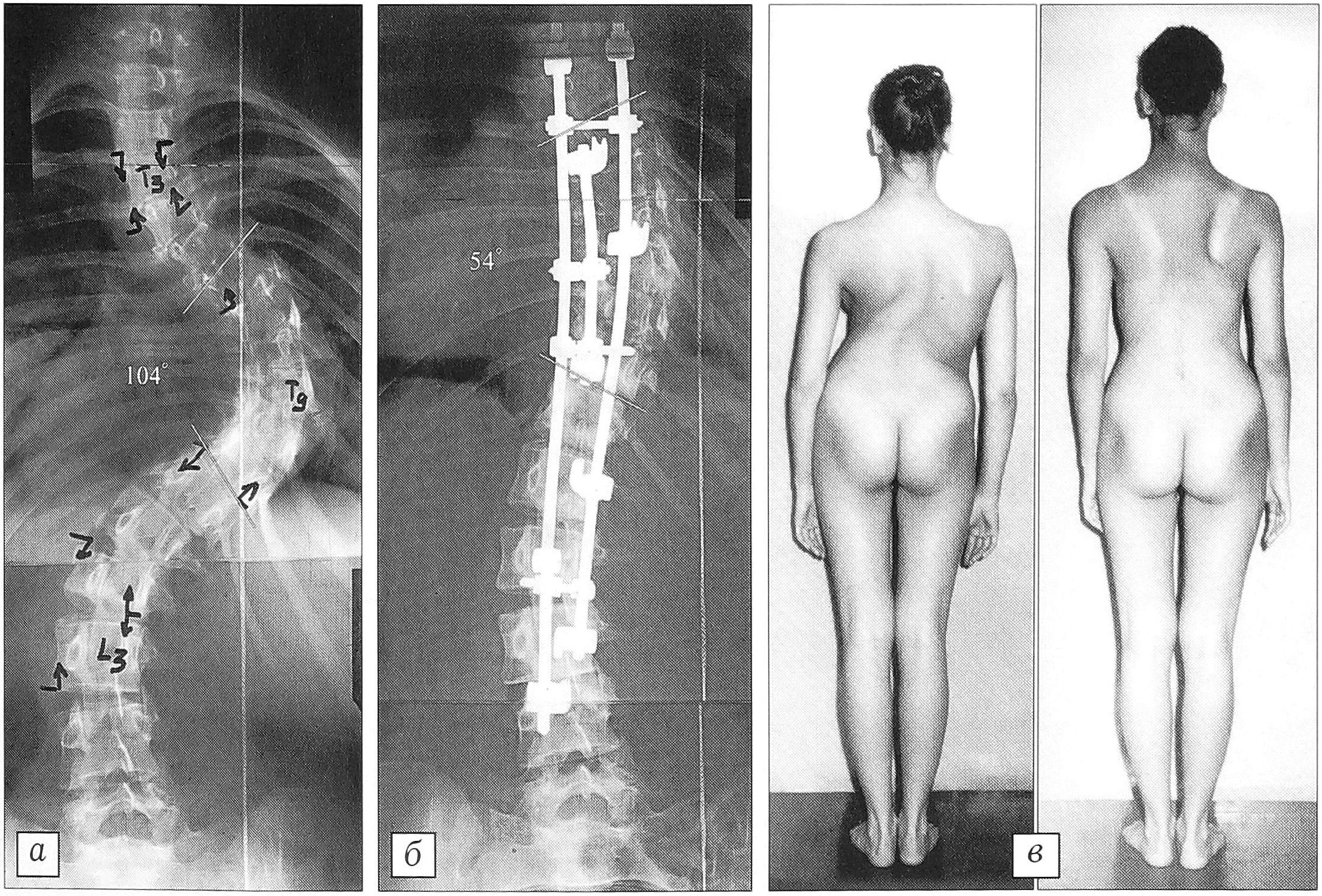 Рис. 5. Больная Г-ва 16 лет (подростковый сколиоз). Коррекция первичной дуги в результате двухэтапного вмешательства с использованием трехстержневой техники со 105° (а) до 54° (б). Срок наблюдения 3 года (в), потеря коррекции 2°.