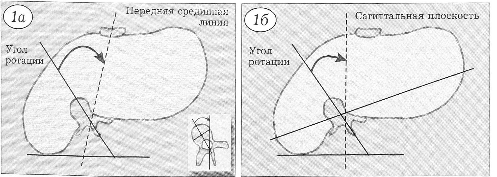 Ротацию вершинного позвонка измеряли по методике Ааго и Dahlborn относительно сагиттальной плоскости. Измерение можно проводить и относительно передней срединной линии, но получаемые при этом данные не отражают реальную ротацию. Использование для расчетов сагиттальной плоскости минимизирует ошибки, возможные в случаях выраженной деформации позвоночника и грудной клетки и обусловленные положением пациента в момент исследования [7]. На рис. 1 представлена схема измерения ротации позвонка двумя упомянутыми способами при тяжелой деформации позвоночника и грудной клетки. Различия в результатах измерения обусловлены грубой анатомической деформацией и ротацией туловища относительно тазового пояса.