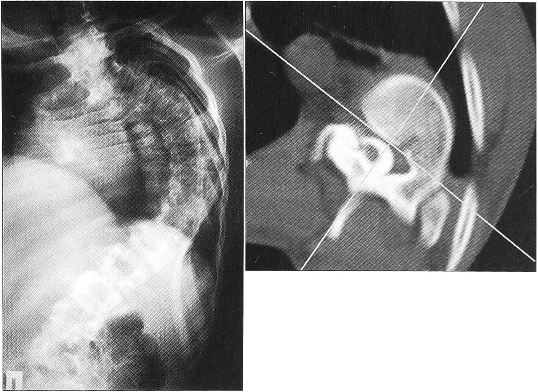 Исследовали ротацию вершинного и нейтральных позвонков, выбранные параметры грудной клетки для оценки ее формы и размеров на уровне вершинного позвонка в горизонтальной плоскости, костную плотность тел вершинного и нейтральных позвонков, положение спинного мозга, его отношение к стенкам позвоночного канала, состояние субарахноидального пространства (при сочетании с миелографией); все данные получали в процессе одного исследования.