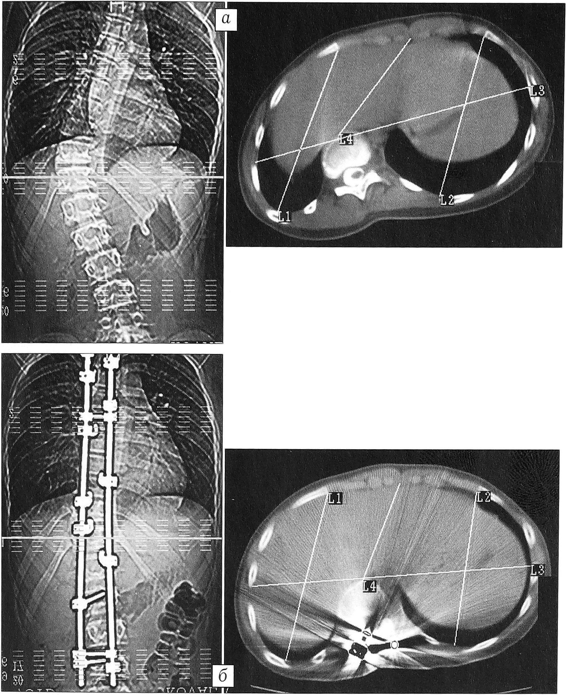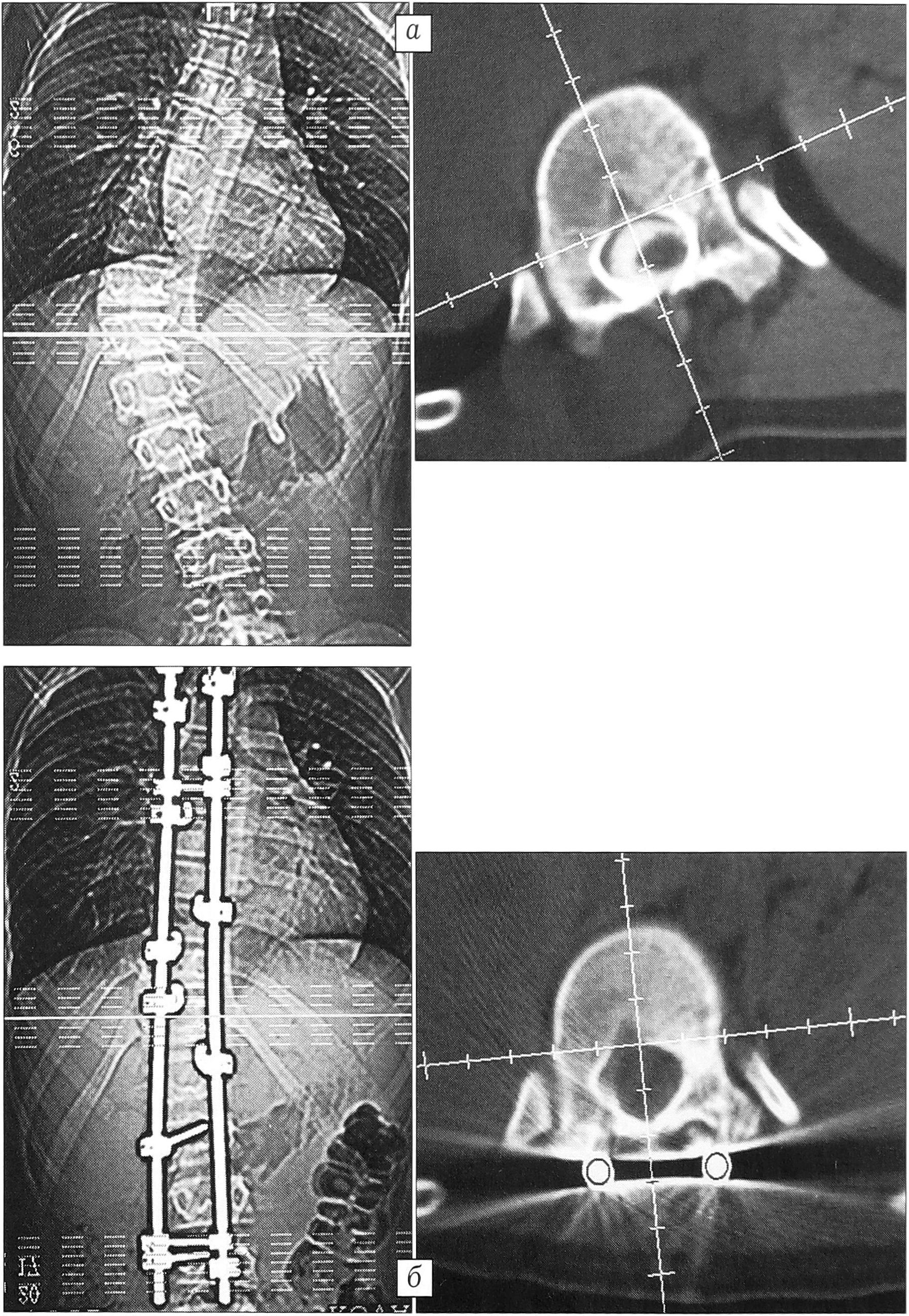 Рис. 4. КТ больной К. с правосторонним грудным сколиозом до (а) и после (б) оперативного лечения. Деротация вершинного позвонка 17° (70,8%).