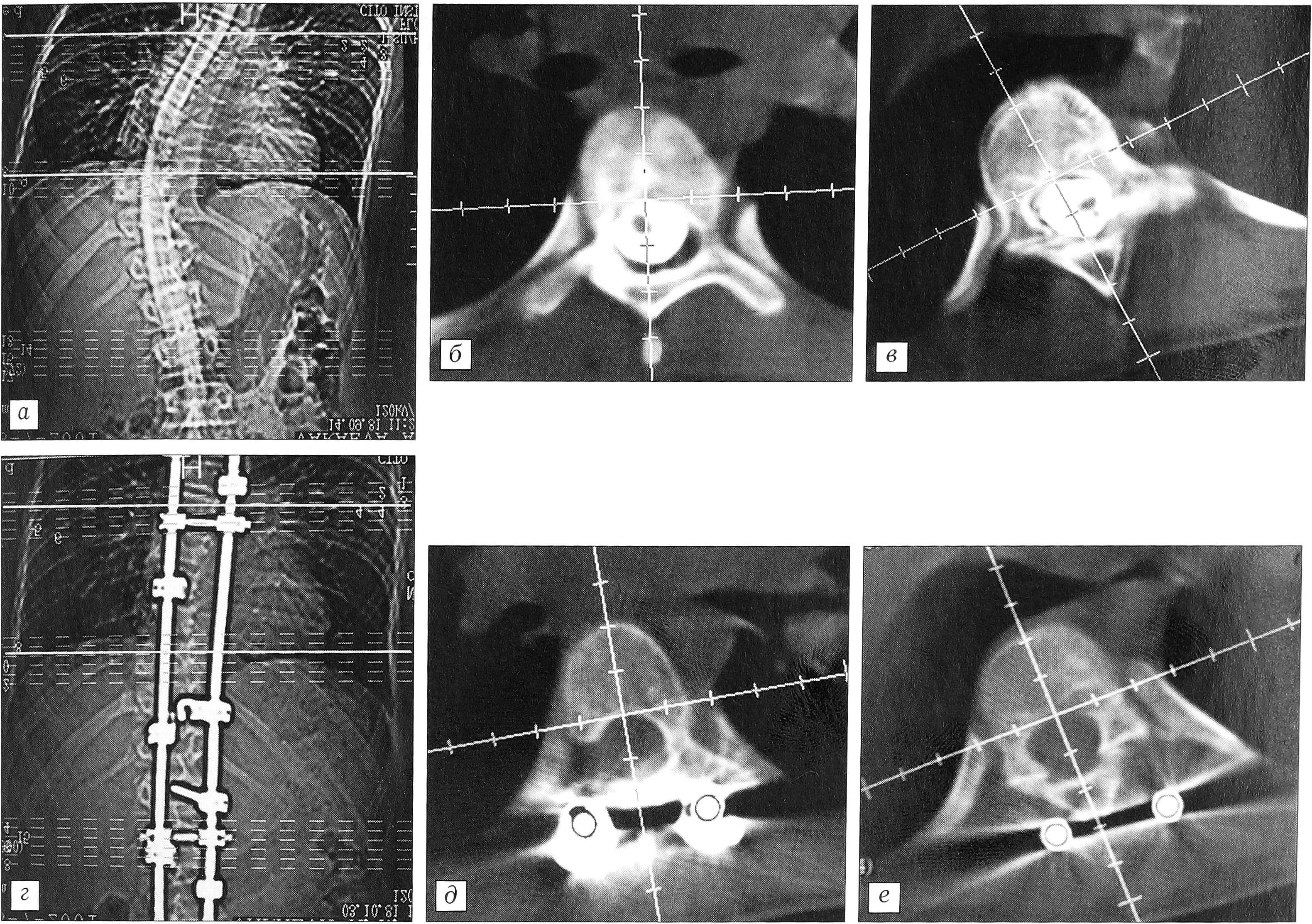 Рис. 5. КТ больного В. с правосторонним грудным сколиозом до (а—в) и после (г—е) оперативного лечения. б, д — верхний нейтральный, в, е — вершинный позвонок.