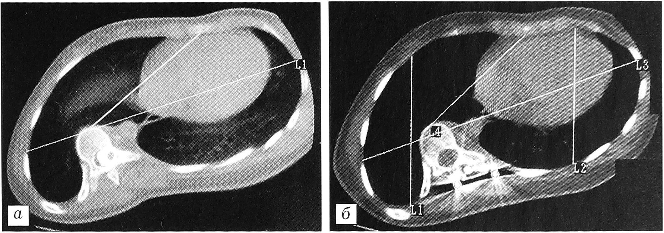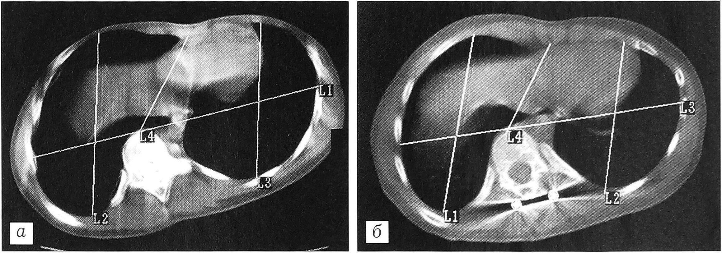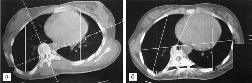 Рис. 8. Расстояние от наиболее дорсальной до наиболее вентральной точки грудной клетки справа до (а) и после (б) оперативного лечения (максимальное в исследуемой группе увеличение данного параметра).