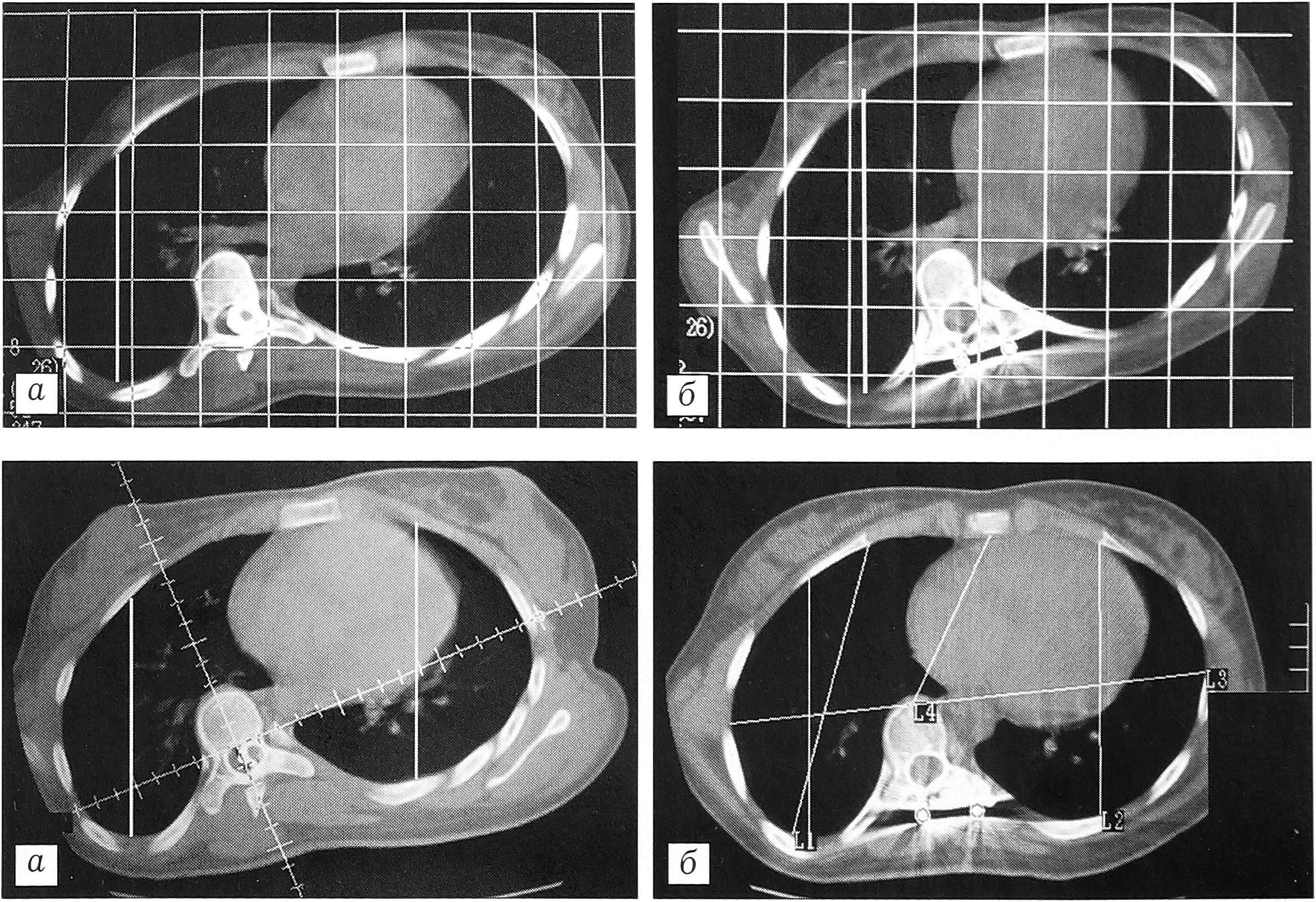 При расчете ротации вершинного позвонка указанными выше способами не принимается во внимание положение грудной клетки относительно горизонтальной плоскости пространства, когда в положении пациента лежа ее фронтальная плоскость не совпадает с горизонтальной плоскостью пространства, образуя острый угол. После оперативного лечения форма грудной клетки, ротация туловища относительно тазового пояса изменяются, положение пациента относительно горизонтальной плоскости пространства при повторном обследовании также несколько меняется. Эти изменения у больных с III—начальной IV степенью сколиоза при измерении дают величины в пределах 5°, что укладывается в границы ошибки метода. Вместе с тем выраженная деформация грудной клетки, значительная ротация туловища относительно тазового пояса и обусловленное этим нестандартное положение пациента относительно горизонтальной плоскости пространства могут приводить к ошибкам измерения истинной ротации позвоночника и должны учитываться при проведении исследования.