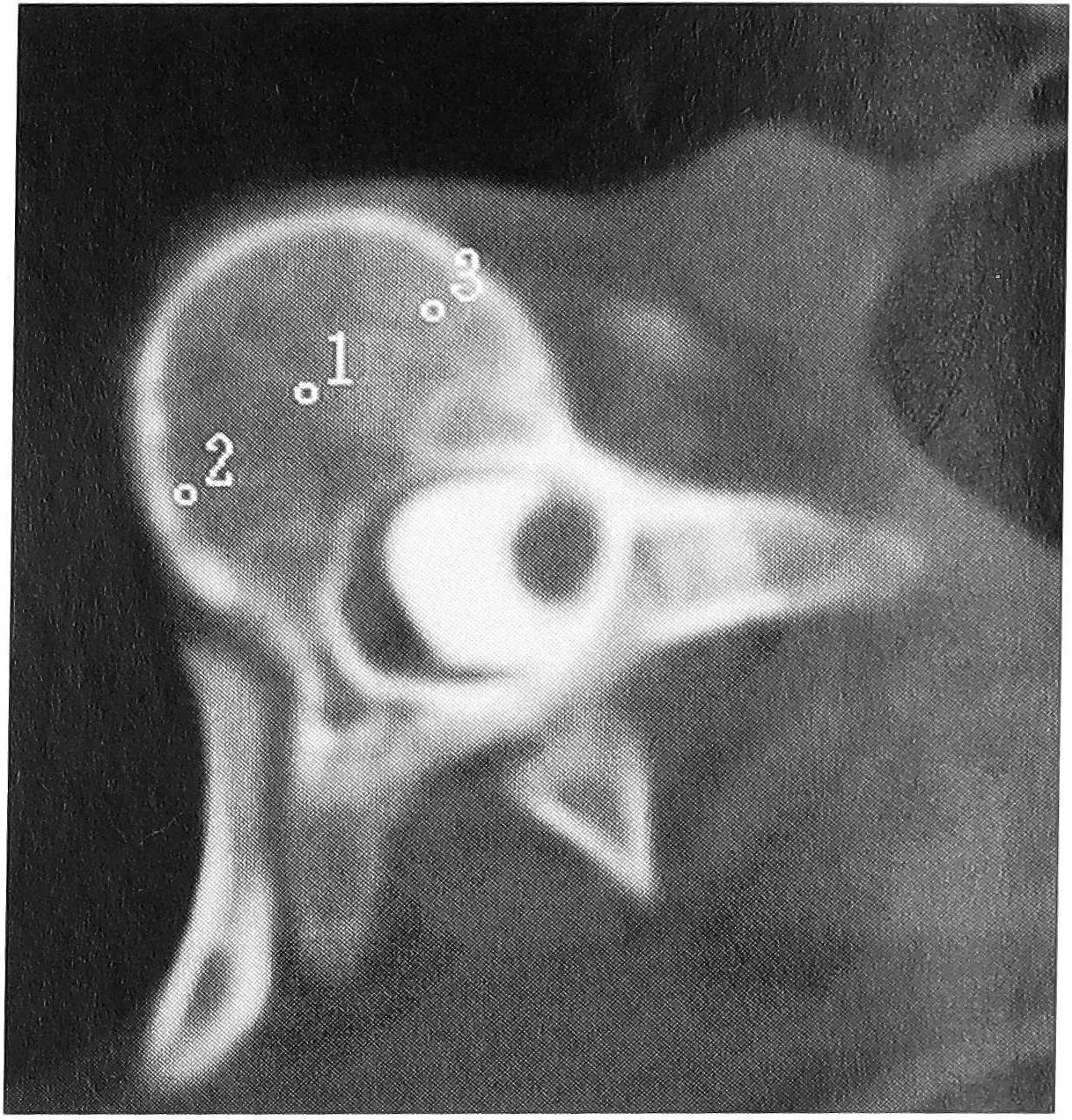 Измерение костной плотности проводили на уровне вершинного, верхнего и нижнего нейтральных позвонков, на каждом уровне в трех точках: в центре тела, у правого края и у левого края тела позвонка в пределах губчатой кости.