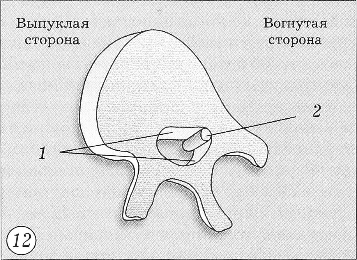 Рис. 12. Схема расположения спинного мозга в позвоночном канале на уровне вершинного позвонка первичной дуги сколиотической деформации (1 — позвоночный канал; 2 — спинной мозг).