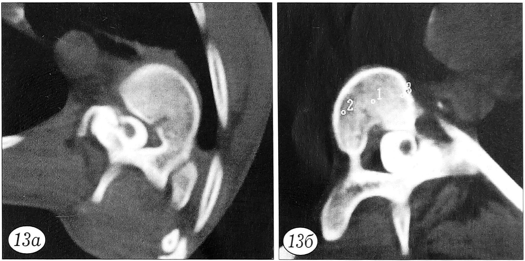 На уровне вершинного позвонка первичной дуги сколиотической деформации значимых различий в костной плотности, измеренной до и непосредственно после оперативного лечения, не обнаружено. Вместе с тем выявлена следующая закономерность: средняя величина костной плотности на вогнутой стороне деформации значимо больше, чем на выпуклой, как до, так и после оперативного лечения. Более высокая плотность костной ткани на вогнутой стороне деформации определяется и визуально при КТ (рис. 11).
