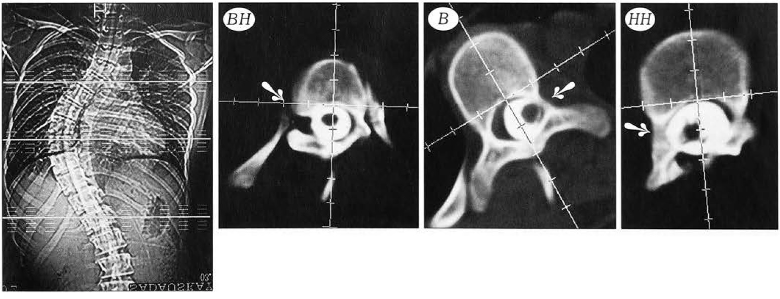 Использование метода компьютерной томографии на этапе предоперационного обследования пациентов дает уникальную информацию, характеризующую сколиотический позвоночник в целом и каждый отдельный позвонок (ротацию, торсию, костную плотность тел вершинного и нейтральных позвонков), соотношение с деформированным позвоночным каналом спинного мозга (положение, отношение к стенкам канала) и субарахноидального пространства (расширение, сужение, деформация); позволяет рассчитать и проанализировать установленные параметры грудной клетки на уровне вершинного позвонка в горизонтальной плоскости для оценки ее формы, размеров и возможностей коррекции.