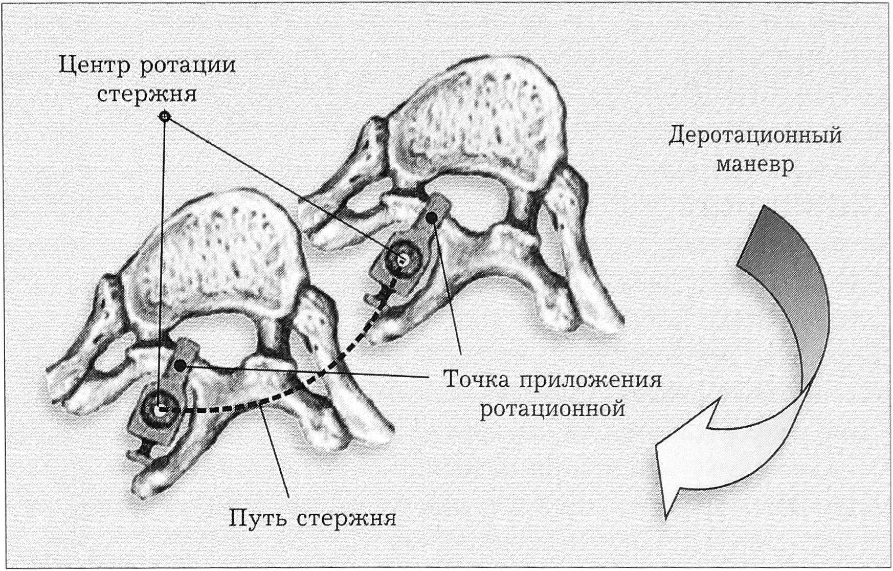 Возможно, объяснение состоит в следующем. Рассмотрим позвонок на три сегмента ниже апикального. Крючок, расположенный сзади оси производимой ротации, не контролирует тело позвонка в такой степени, чтобы обеспечить его деротацию, хотя и обеспечивает коррекцию сагиттального профиля. Позвонок в целом смещается кзади и к срединной линии тела, при этом происходит некоторая деротация, а при движении крючка относительно дуги возможно даже усиление ротации (рис. 15).