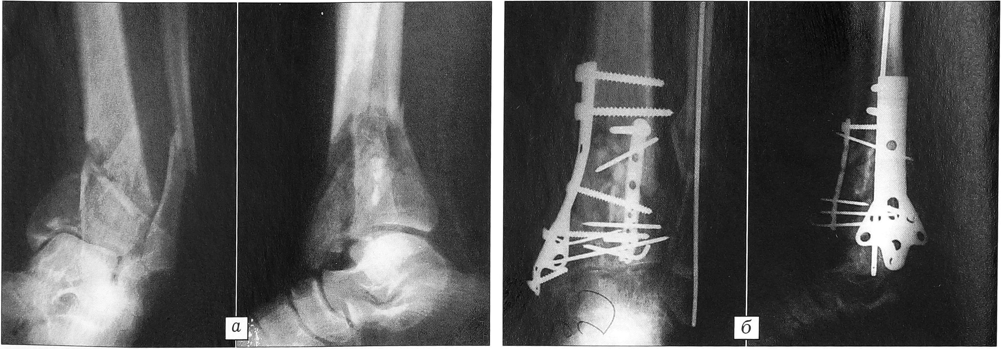Рис. 2. Рентгенограммы больного Б. 51 года. Многооскольчатый компрессионный перелом дистального метаэпифиза большеберцовой кости (вариант Д). а — до операции; б — после остеосинтеза реконструктивной и Т-образной пластинами.