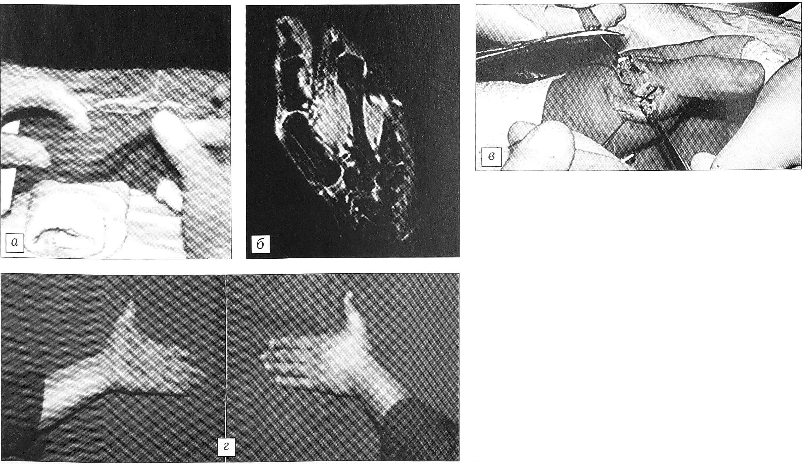 Рис. 3. Больной С. 35 лет. Полное повреждение лучевой коллатеральной связки. Обратился через 3 мес после травмы с жалобами на боли и нестабильность в пястно-фаланговом суставе I пальца правой кисти. а — при поступлении: имеется клиника повреждения лучевой коллатеральной связки, нестабильность более выражена после проведения анестезии; б — на МРТ подвывих основной фаланги I пальца; в — основной этап операции (пластика поврежденной связки): устранен подвывих, материал «полисорб» проведен через внутрикостные каналы; г — через 1 год после операции: боли исчезли, достигнута стабильность сустава при небольшом ограничении разгибания.
