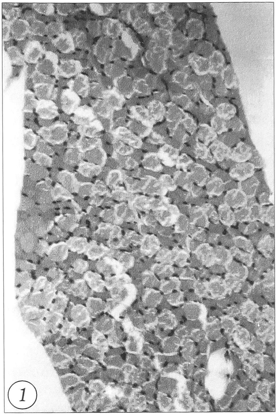 Рис. 1. Участок из верхней трети передней большеберцовой мышцы собаки через 28 дней иммобилизации коленного сустава аппаратом Илизарова: очаговый лизис миофибрилл, очаговая атрофия части мышечных волокон. Поперечный срез. Окраска гематоксилином и эозином. Ок. 10, об. 16.