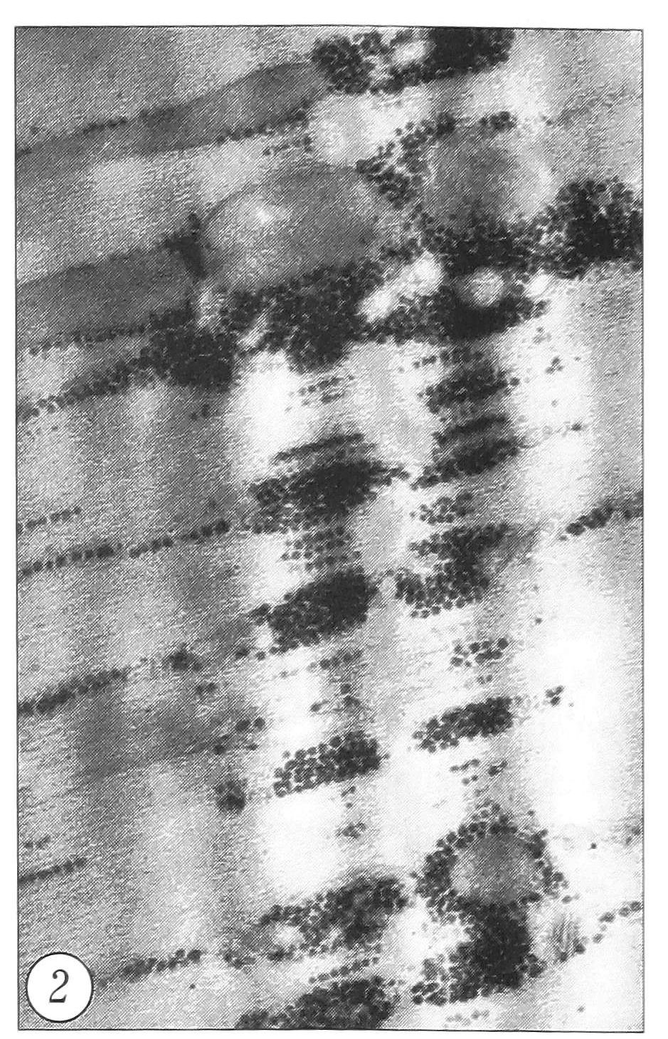 Рис. 2. Ультраструктура мышечного волокна передней большеберцовой мышцы собаки через 28 дней иммобилизации коленного сустава аппаратом Илизарова: обилие гранул межфибриллярного гликогена. Электронограмма. Инструментальное ув. 16000