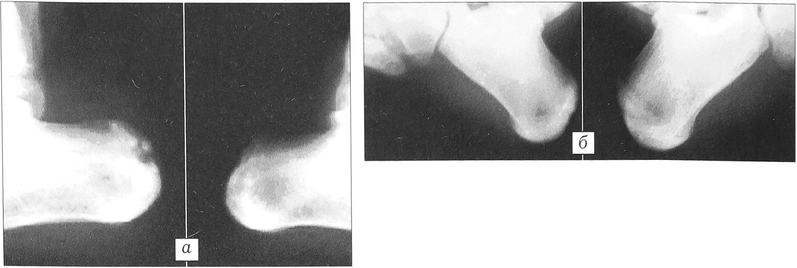 Рис. 1. Больной К. 14 лет. Диагноз: болезнь Хаглунда—Шинца справа. а — рентгенограммы до операции: дефект области бугра правой пяточной кости; б — рентгенограммы через 6 мес после операции: практически полное закрытие дефекта.