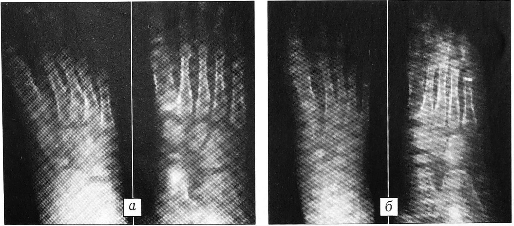 Рис. 2. Больной Л. 12 лет. Диагноз: болезнь Келера 1 справа. а — рентгенограммы до лечения: деструкция ладьевидной кости с признаками фрагментации; б — рентгенограммы через 12 мес после введения биоактивной композиции ППМ-1: восстановление структуры ладьевидной кости.
