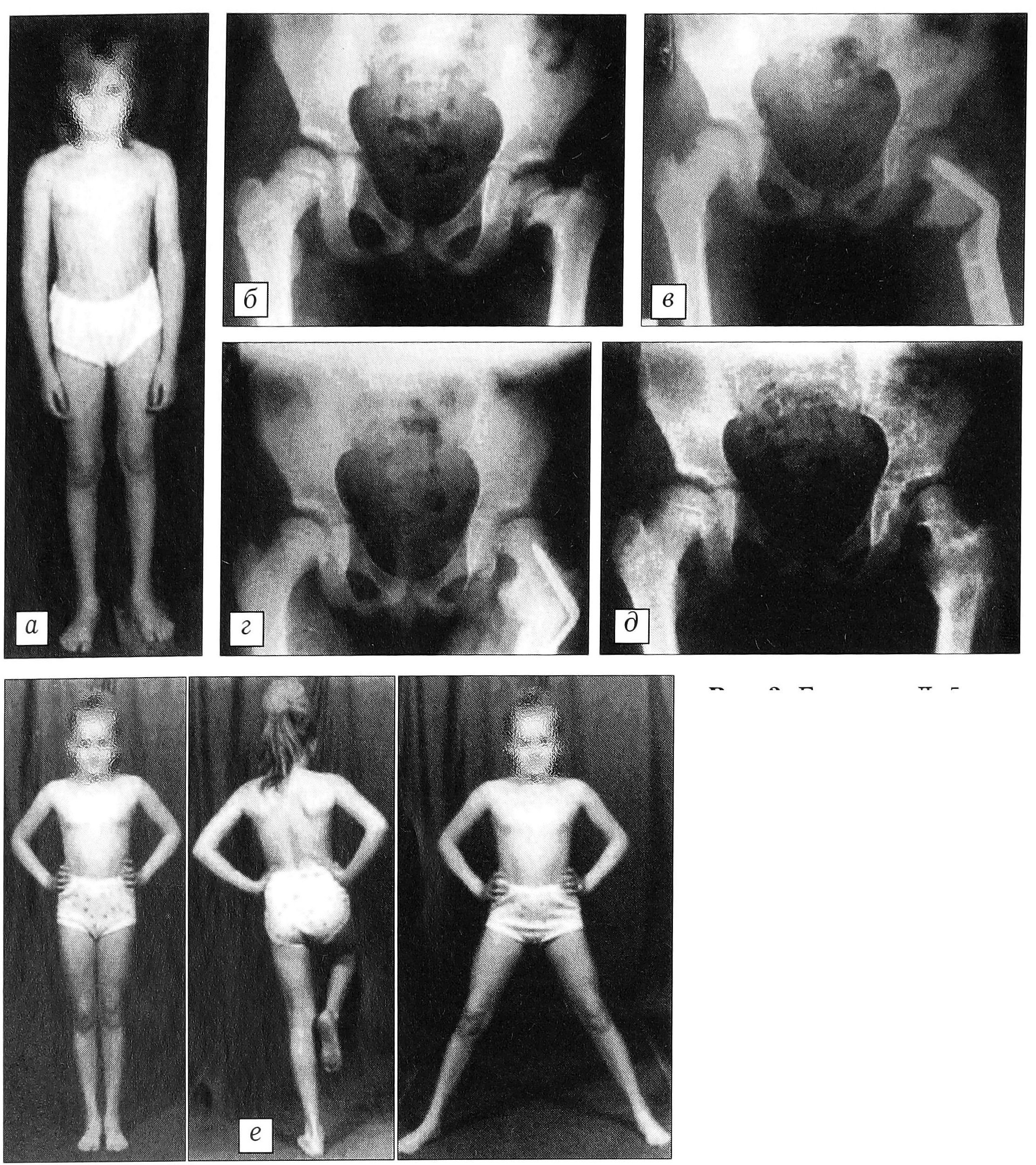 Рис. 3. Больная Л. 5 лет. Диагноз: «дистрофическая» варусная деформация шейки левого бедра. а — внешний вид больной, б — рентгенограмма до операции; в — рентгенограмма после корригирующей остеотомии левого бедра с фиксацией пластиной «ДОН» и туннелизацией шейки биосоломкой АРЕКОС; г — рентгенограмма через 4 мес после операции; д — рентгенограмма, е — клинический результат через 1 год после оперативного лечения.