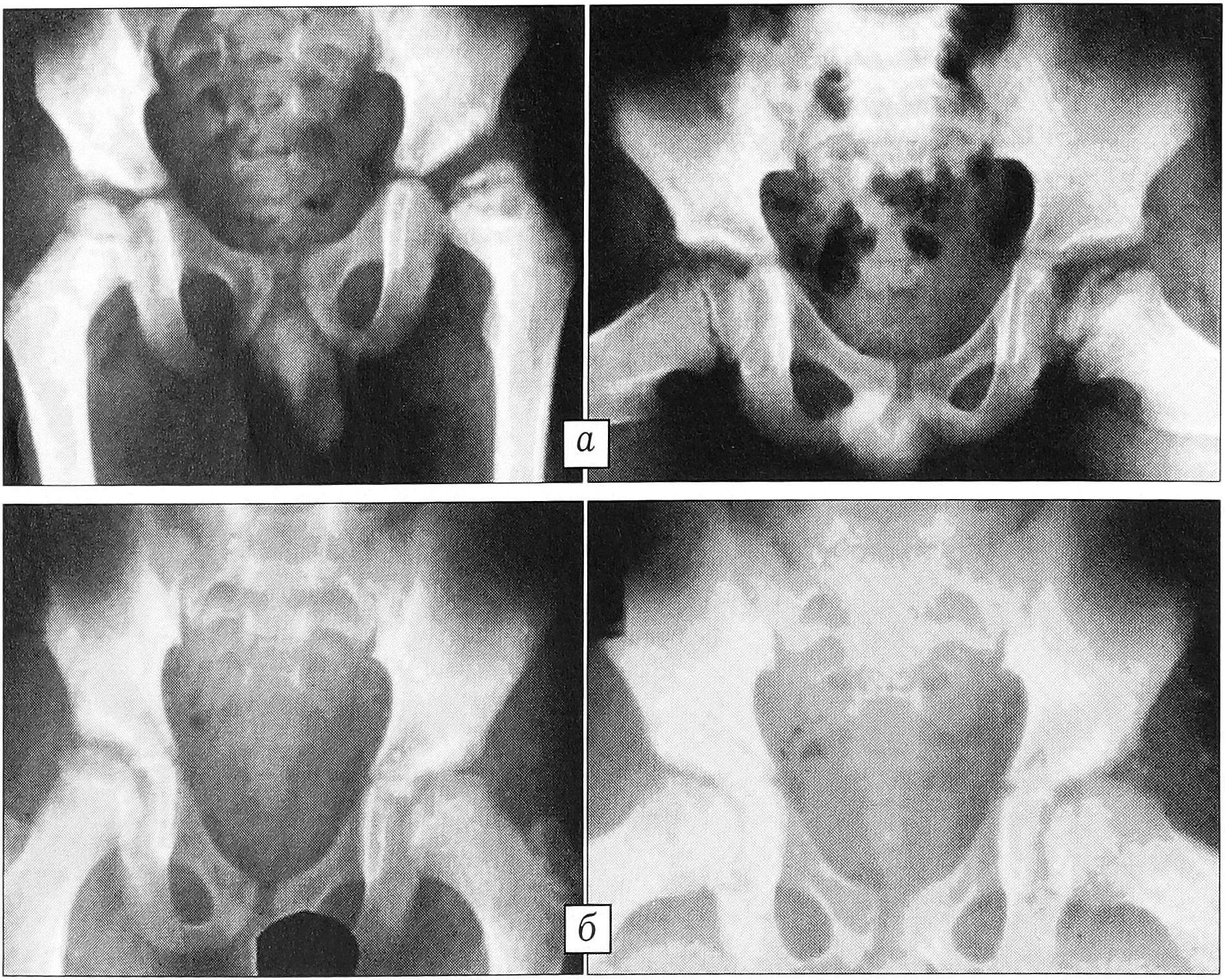 Рис. 4. Больной Г. Диагноз: болезнь Пертеса III стадии слева. а — рентгенограммы до лечения: уплощение головки бедренной кости и ее фрагментация, кисты в шейке; б — рентгенограммы через 1,5 года после начала лечения (туннелизации шейки и введения биоактивной соломки).