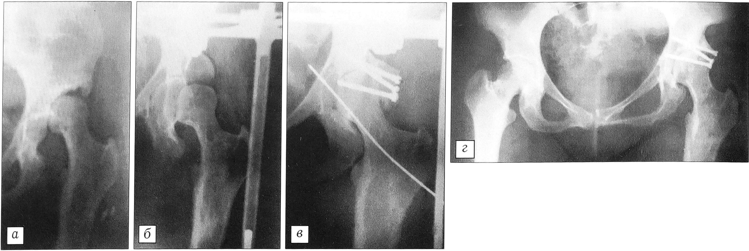 09.09.99 выполнен первый этап операции — наложение анкерно-спицевого аппарата внешней фиксации «таз—бедро» (см. рисунок, б). Через 15 дней бедро было низведено до уровня вертлужной впадины. В этом положении внешняя фиксация продолжалась в течение 30 дней — до полной адаптации мышц бедра и околосуставных мягких тканей. 11.11.99 произведены открытое вправление головки бедра и аутопластика задневерхнего края вертлужной впадины трансплантатами, взятыми из крыла левой подвздошной кости (см. рисунок, в). Фиксация в аппарате продолжалась еще 5 нед. Операционная рана зажила первичным натяжением. Больная передвигалась при помощи костылей. Через 3 мес начала приступать на левую ногу. При обследовании через 2 года: пациентка ходит с опорой на трость, на рентгенограмме: форма вертлужной впадины и костные структуры сустава полностью восстановились (см. рисунок, г). От работы, требующей физической нагрузки, воздерживается. Приобрела новую профессию, не связанную с длительным хождением и подъемом тяжести. Наблюдение продолжается.
