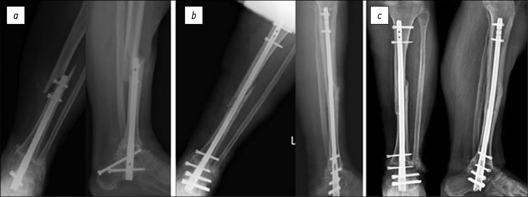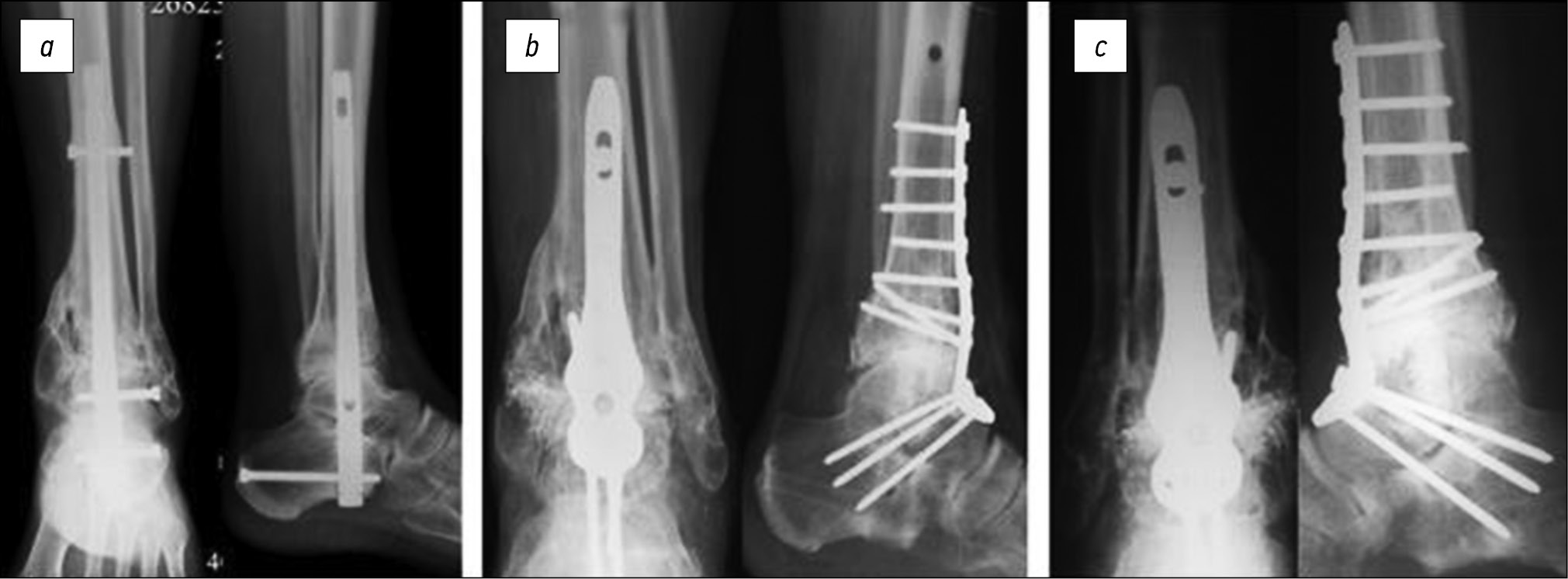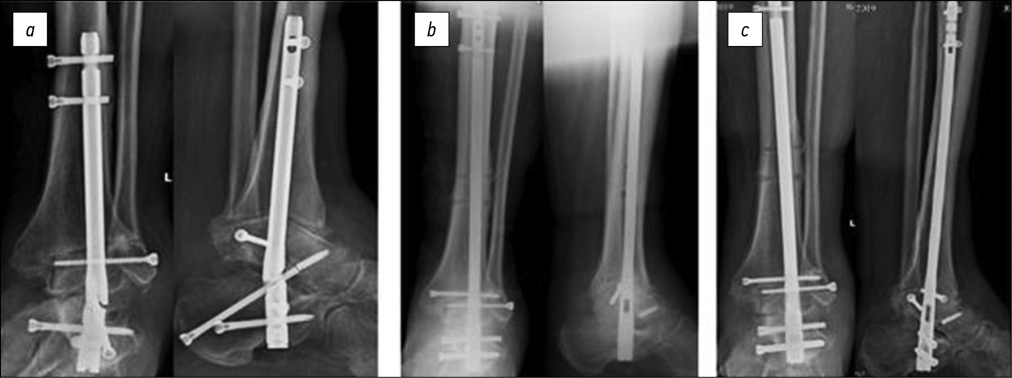 Заключение. Выполнение ревизионных оперативных вмешательств при осложнениях механического происхождения после артродезирования голеностопного сустава с фиксацией интрамедуллярным стержнем требует индивидуального подхода в каждом клиническом случае.