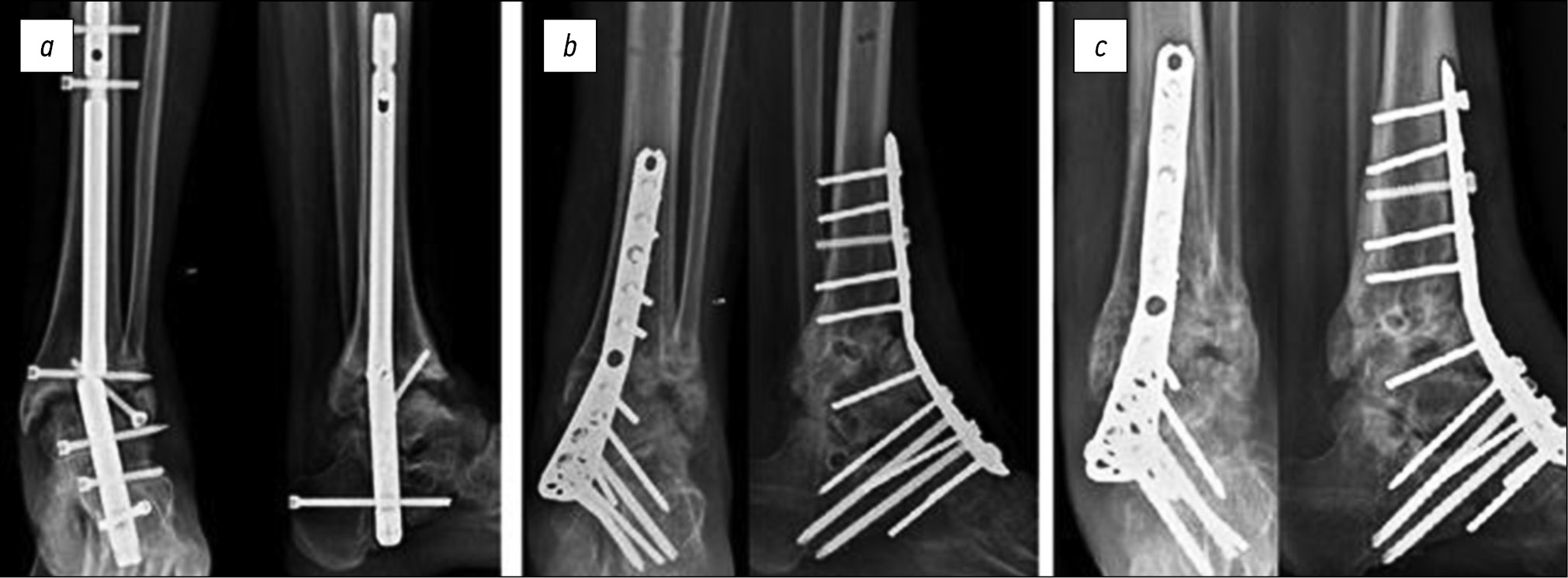 Выбор устройства для фиксации голеностопного сустава обосновывается рядом факторов. При наличии хронического воспаления, в том числе в период стойкой ремиссии, предпочтительно использование аппарата внешней фиксации. Возможность сохранения функции подтаранного сустава, а также авторские предпочтения обусловливают активное применение для фиксации голеностопного сустава компрессионных винтов и накостных пластин с угловой стабильностью винтов. Достаточно широкое распространение имеет интрамедуллярная фиксация с использованием ретроградных блокируемых стержней в связи со своей относительной простотой, особенно при вовлечении в патологический процесс таранно-пяточного сочленения [5–8].