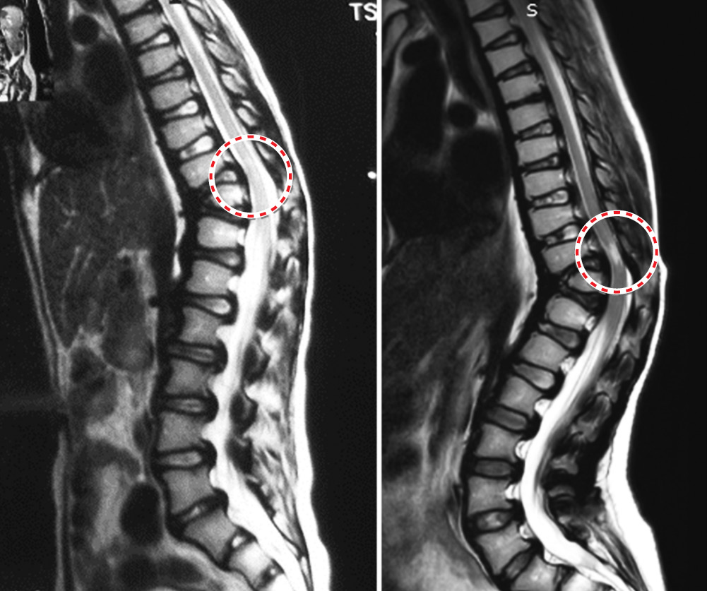 В периоперационном периоде у данной пациентки выявлено наличие кифотической деформации грудопоясничного отдела позвоночника (34°) с очагом миелопатии на вершине кифоза (уровень Th11). Рекомендовано динамическое наблюдение и плановое хирургическое лечение. Однако от предложенного лечения пациентка отказалась. Через 4 года после первой операции стала отмечать трудности при ходьбе, слабость в нижних конечностях, нарушение баланса туловища, выраженные боли в области грудопоясничного отдела позвоночника (8 баллов по визуально аналоговой шкале). На рентгенограммах угол локального кифоза по Сobb составил 50°. Согласно данным МРТ, очаг миелоишемии увеличился (рис. 4).