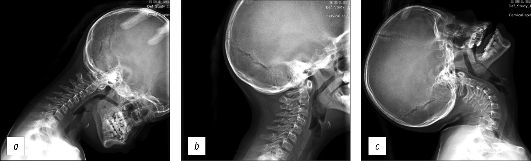 In the absence of signs of neurologic deficit, functional radiographs of the cervical spine were obtained in lateral projection in maximum flexion, extension, and neutral positions. This method of radial diagnosis allows us to fully assess the presence of instability in the craniovertebral junction and indirectly judge the magnitude of spinal canal stenosis and developmental anomalies of the cervical spine [8, 9] (Fig. 1).